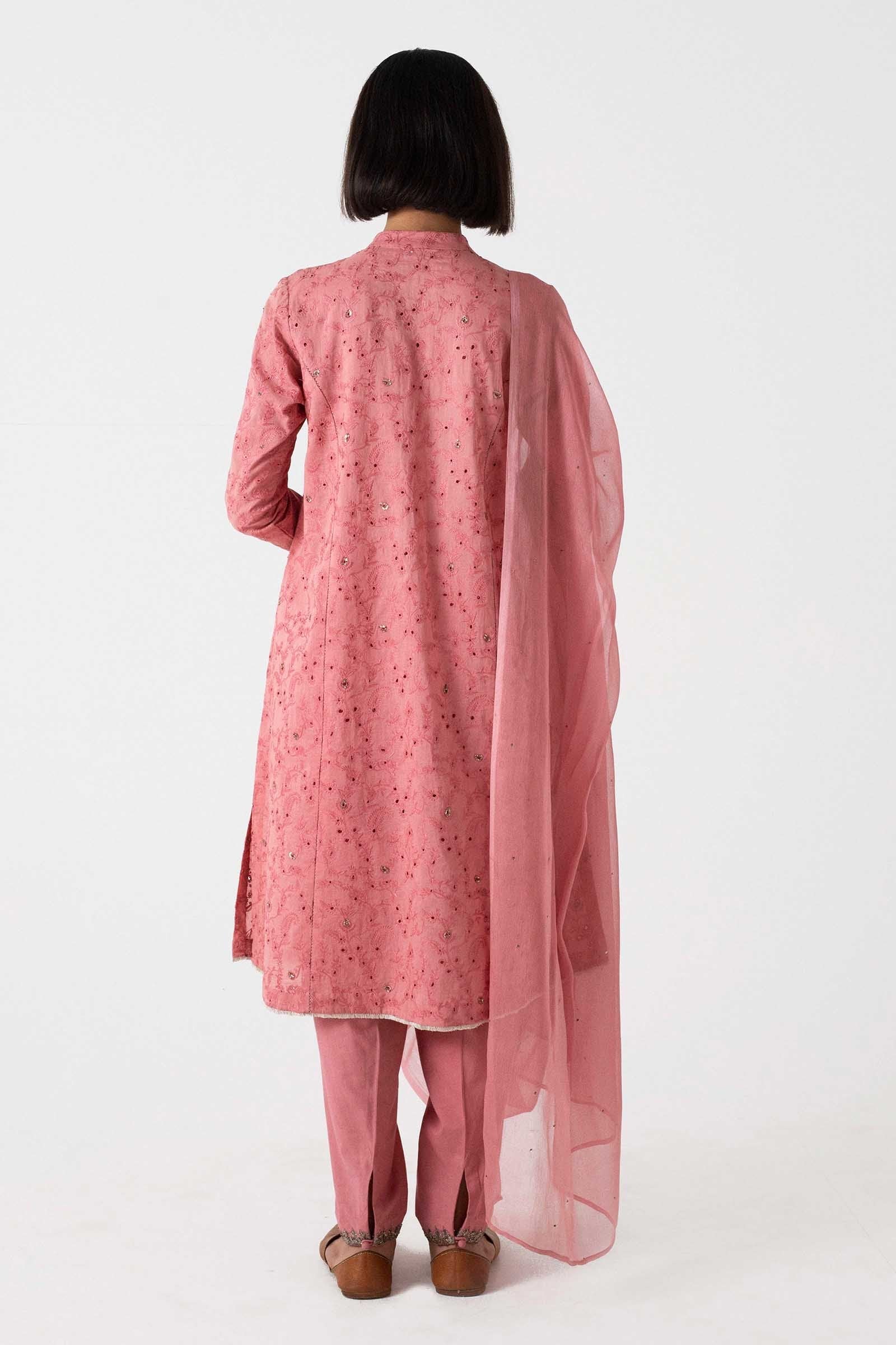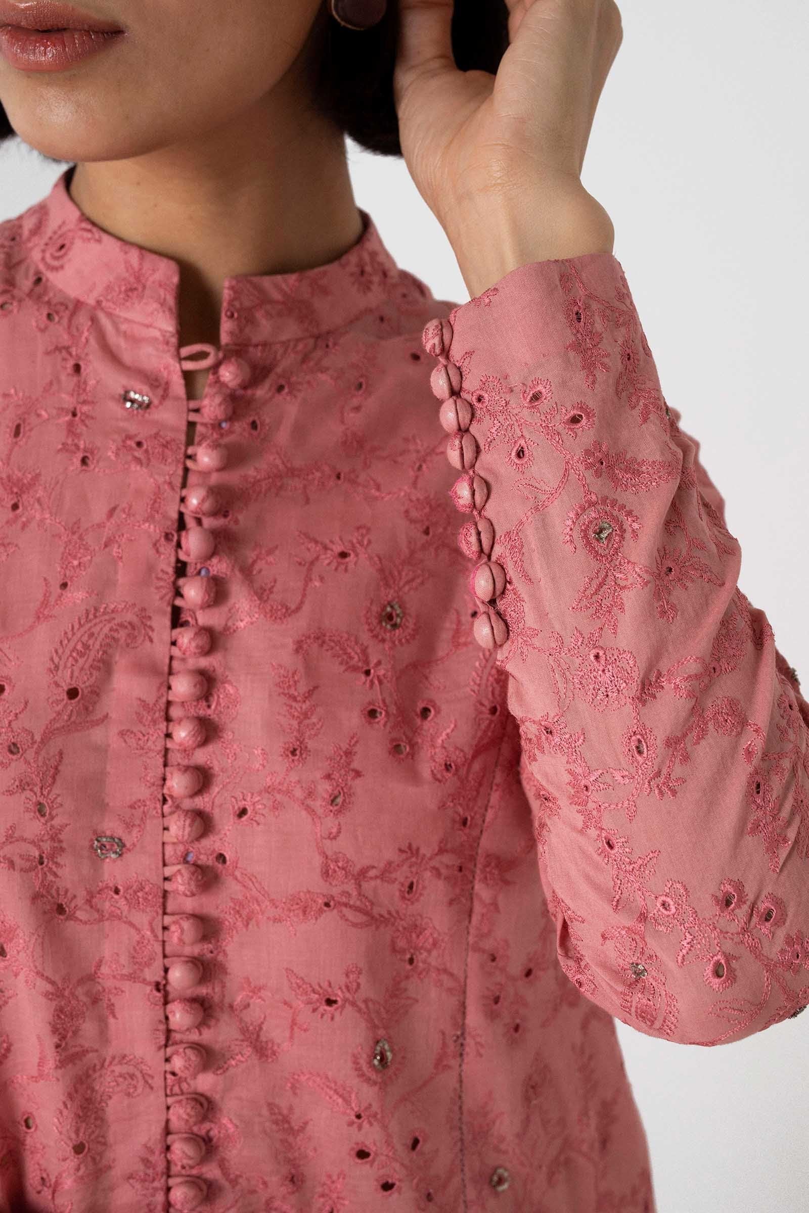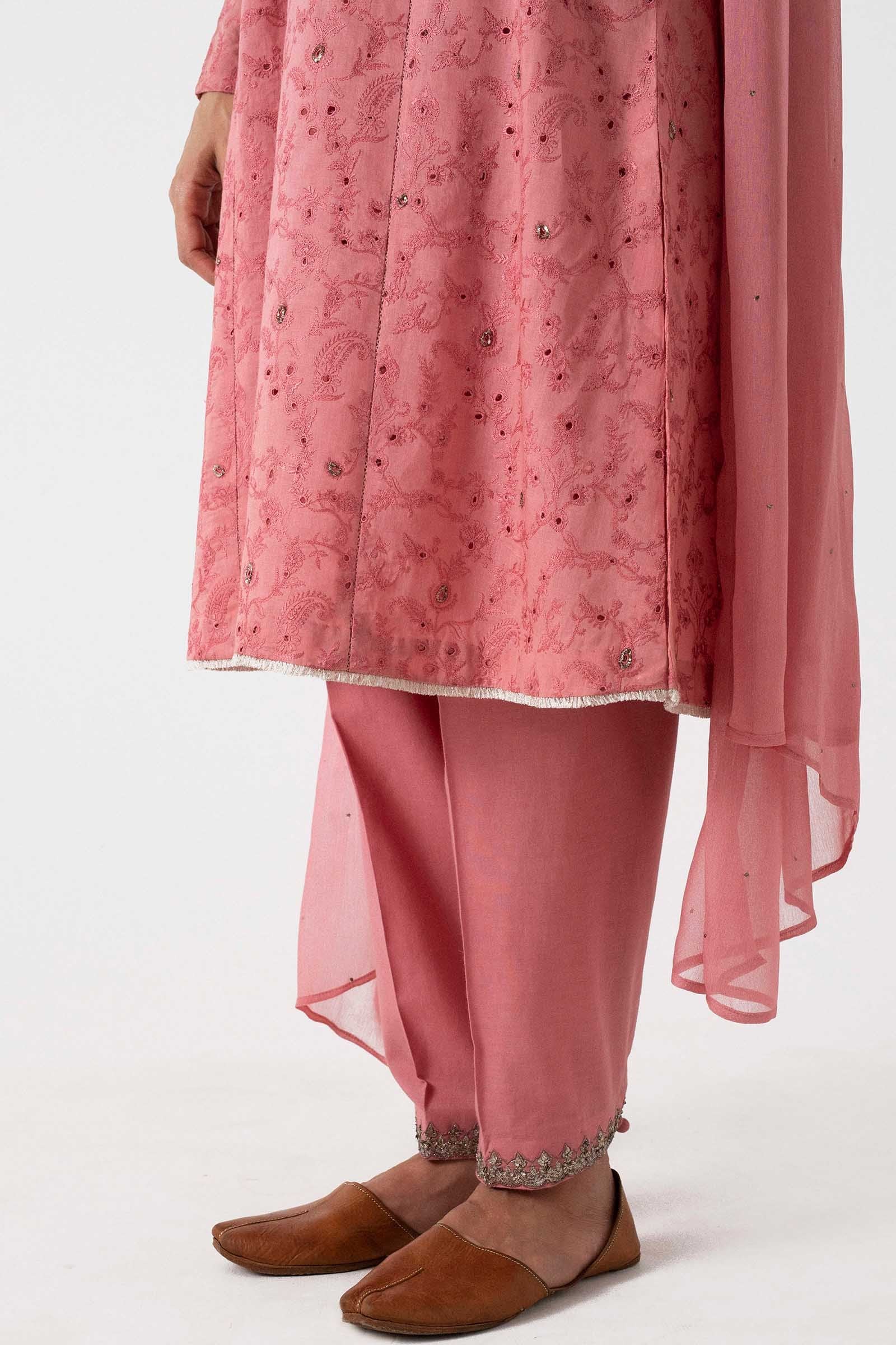 Rouge Pink chikan embroidered kurta with naqshi spray all over, paired with a regular fit shalwar and a mukesh dupatta.