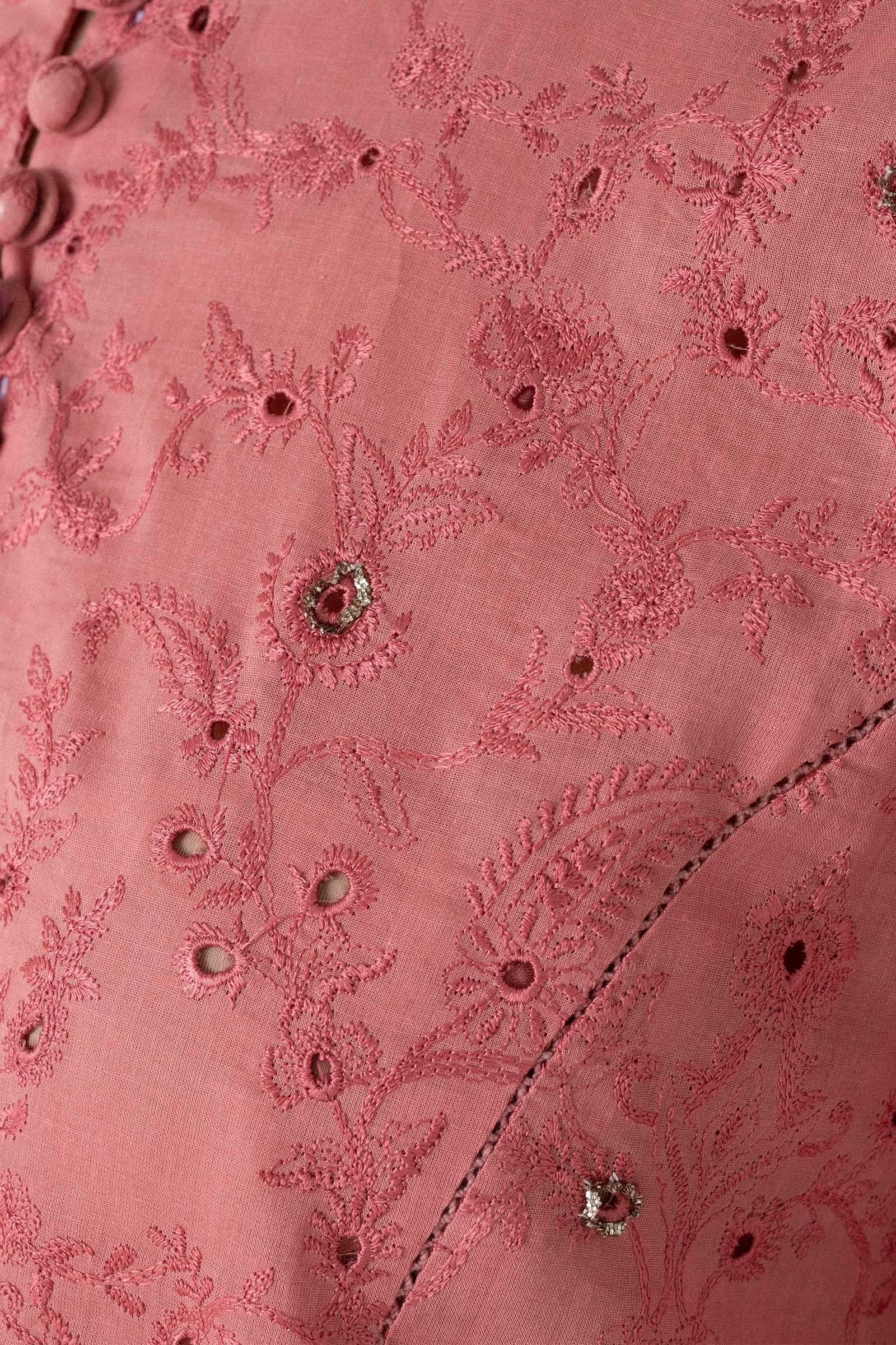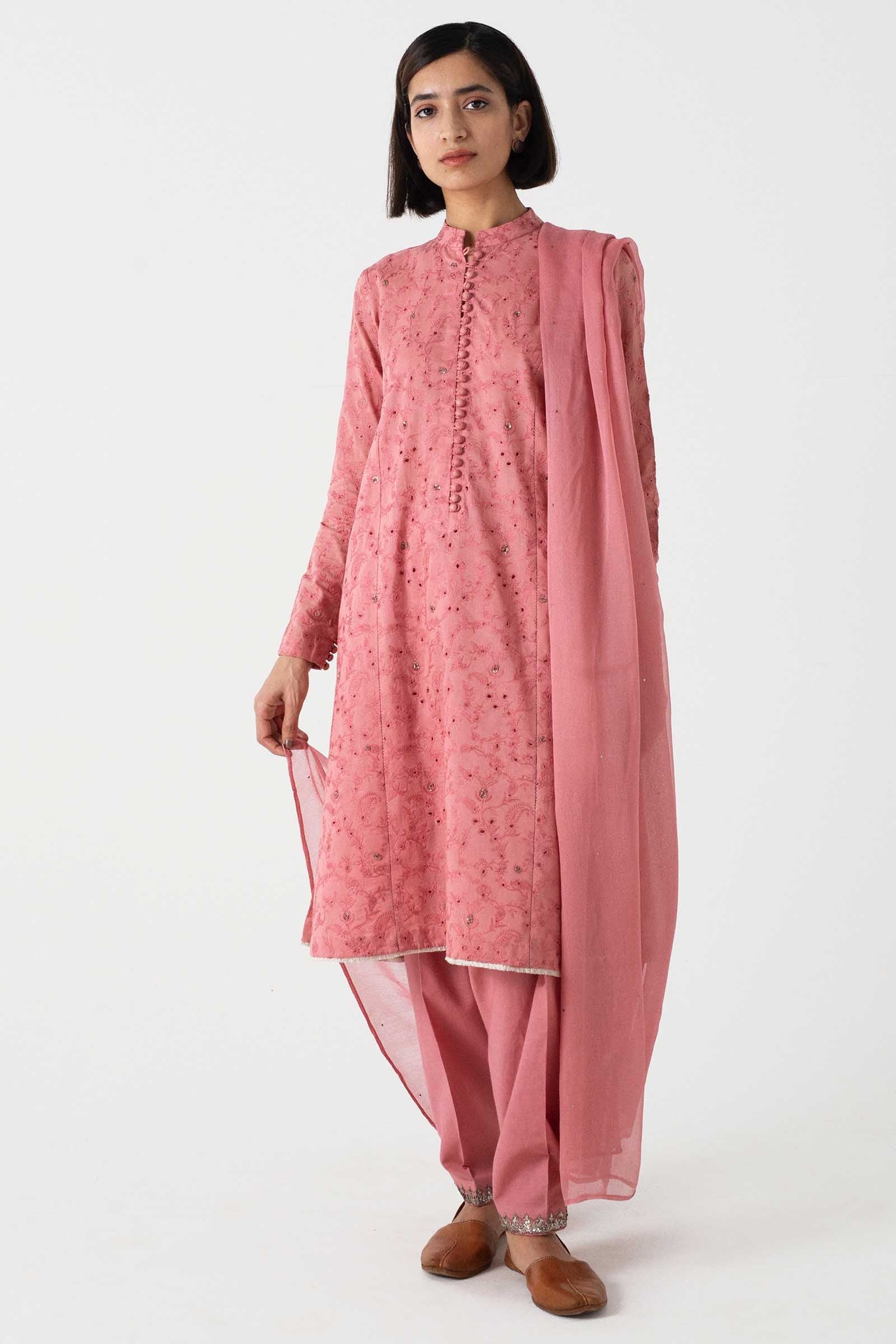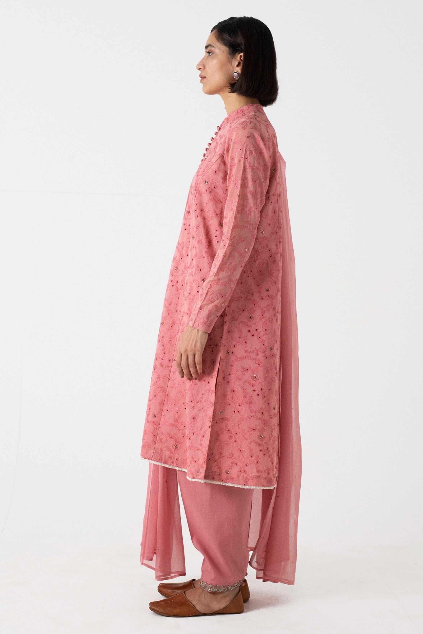 Rouge Pink chikan embroidered kurta with naqshi spray all over, paired with a regular fit shalwar and a mukesh dupatta.