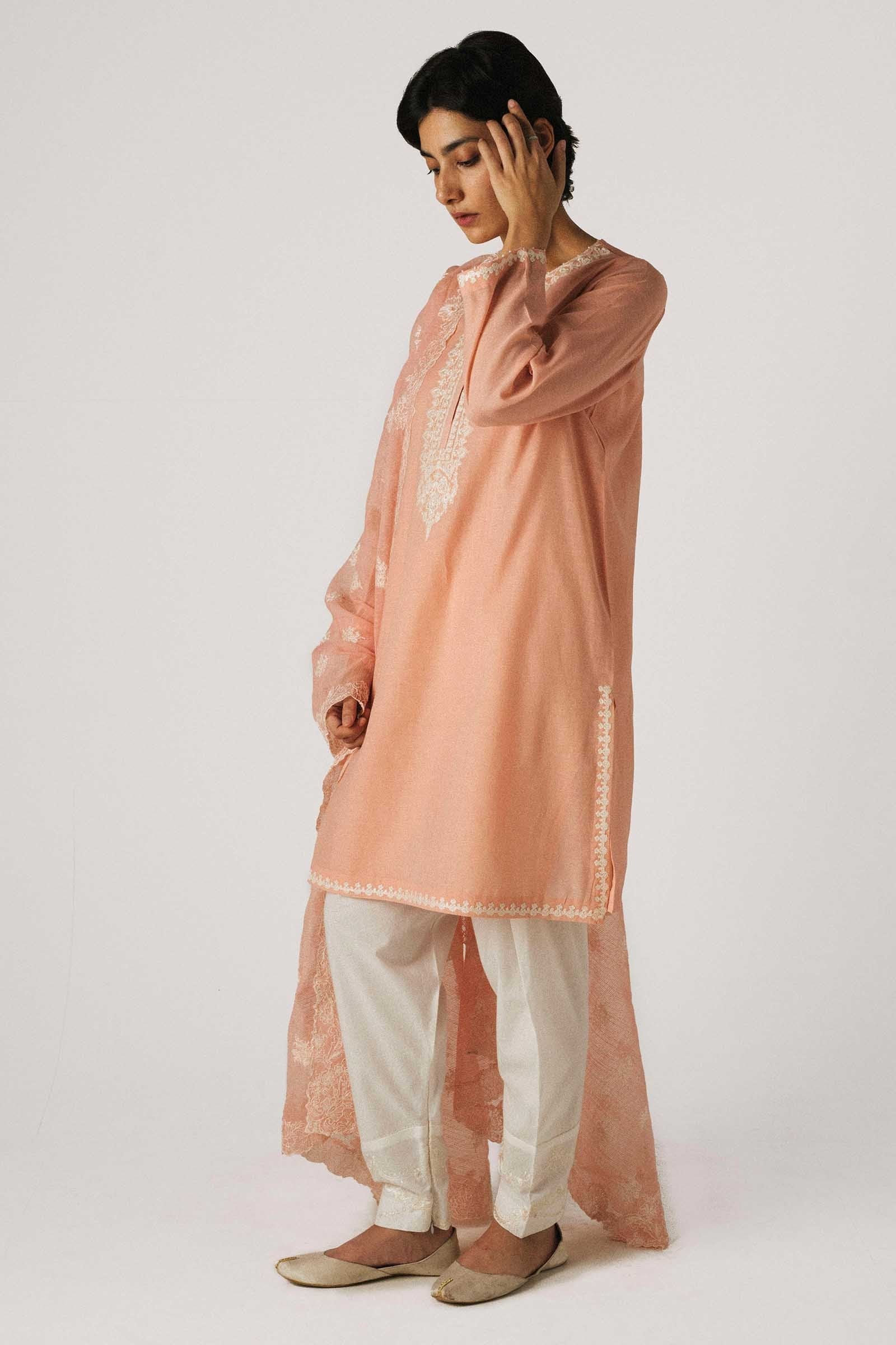 Tea-pink straight-fit kurta with embroidery on neckline, sleeves and hemline, paired with our customized embroidered shalwar and an embroidered cotton net dupatta.