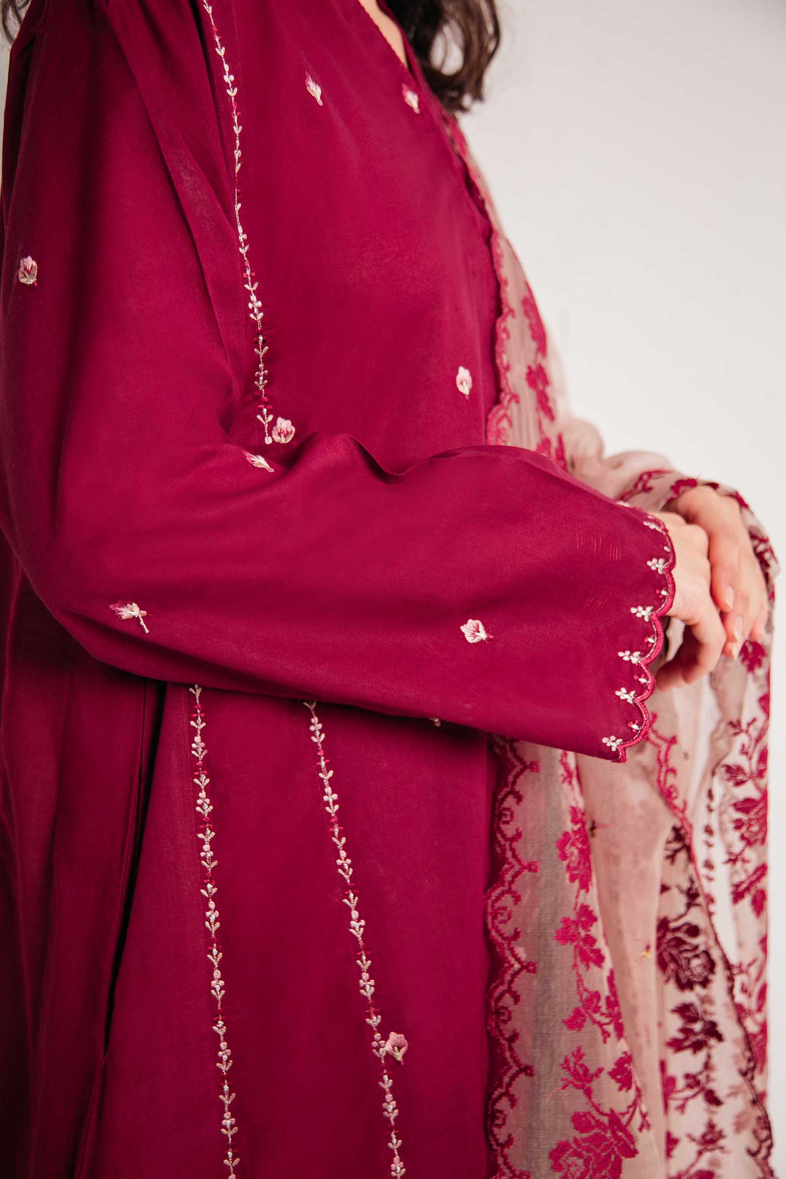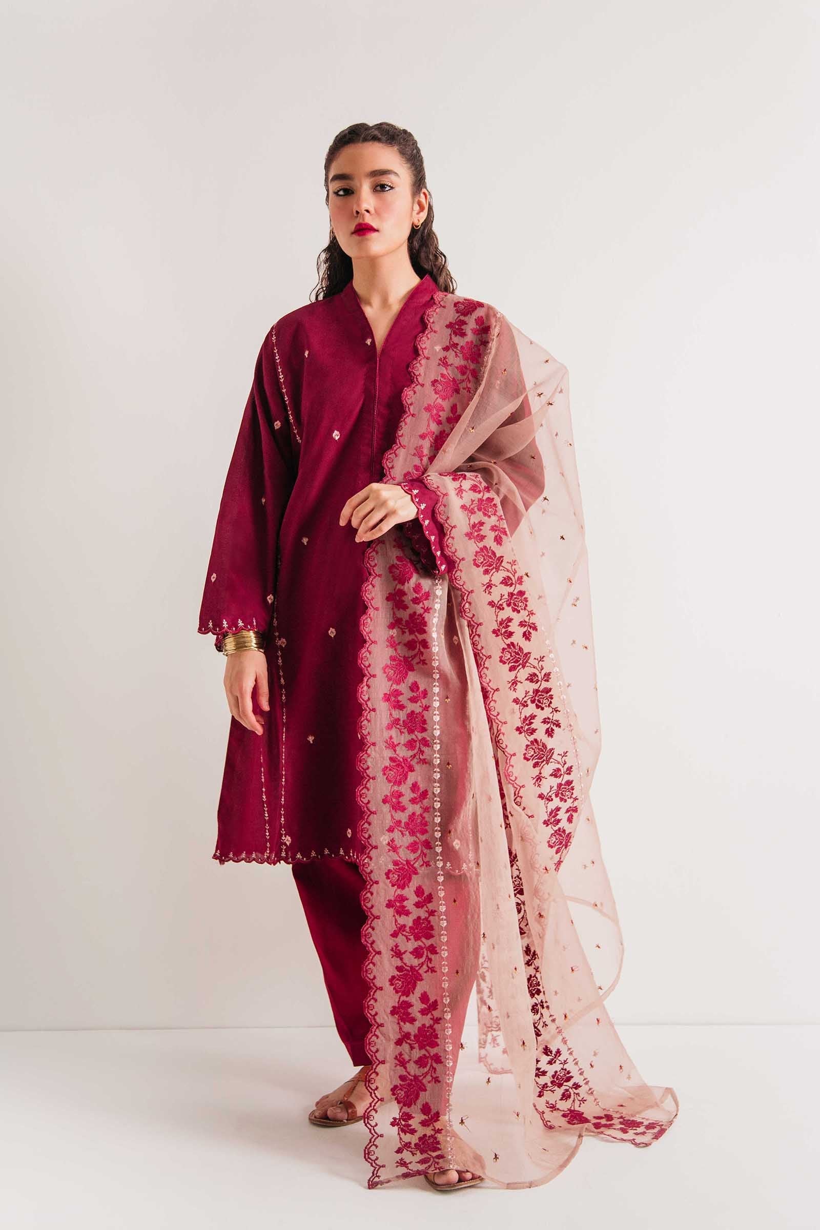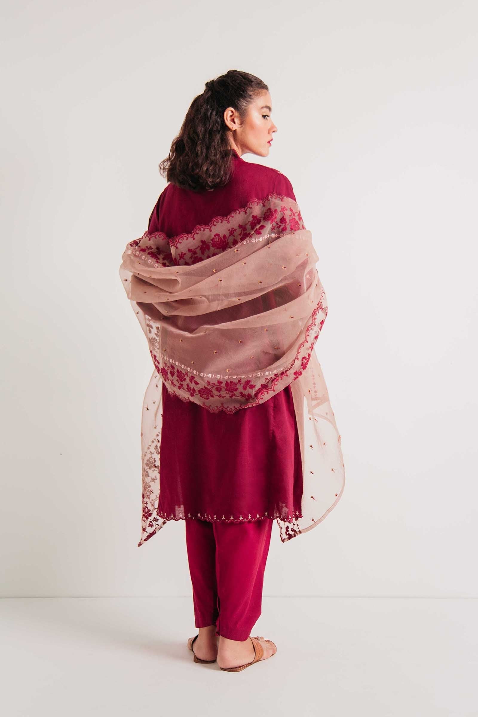 Maroon panelled loose fit embroidered kurta, paired with a shalwar and an exquisite beige embroidered dupatta.