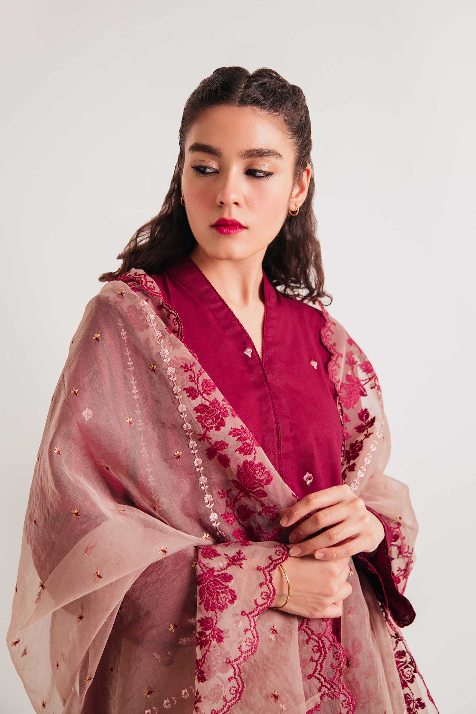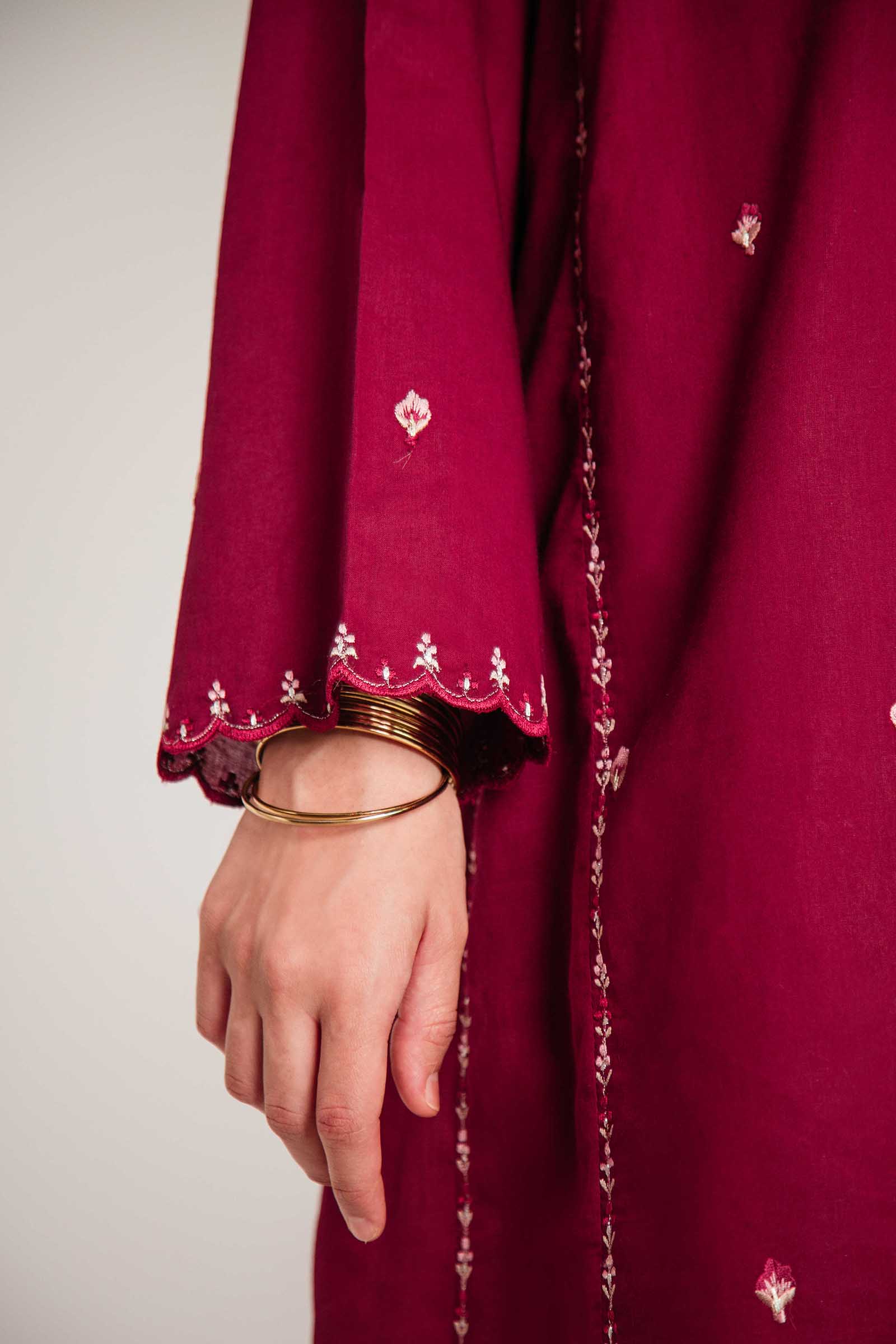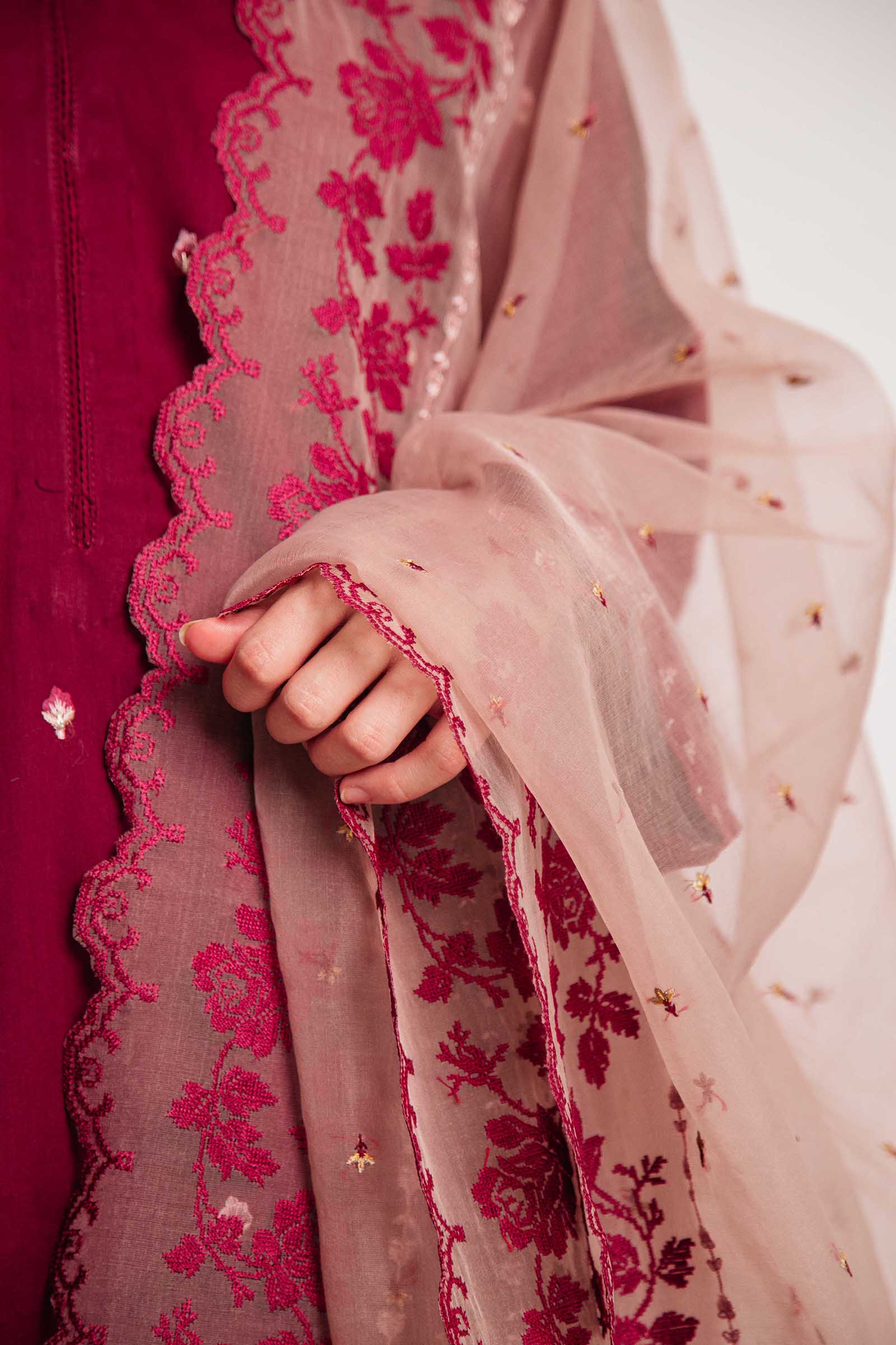Maroon panelled loose fit embroidered kurta, paired with a shalwar and an exquisite beige embroidered dupatta.
