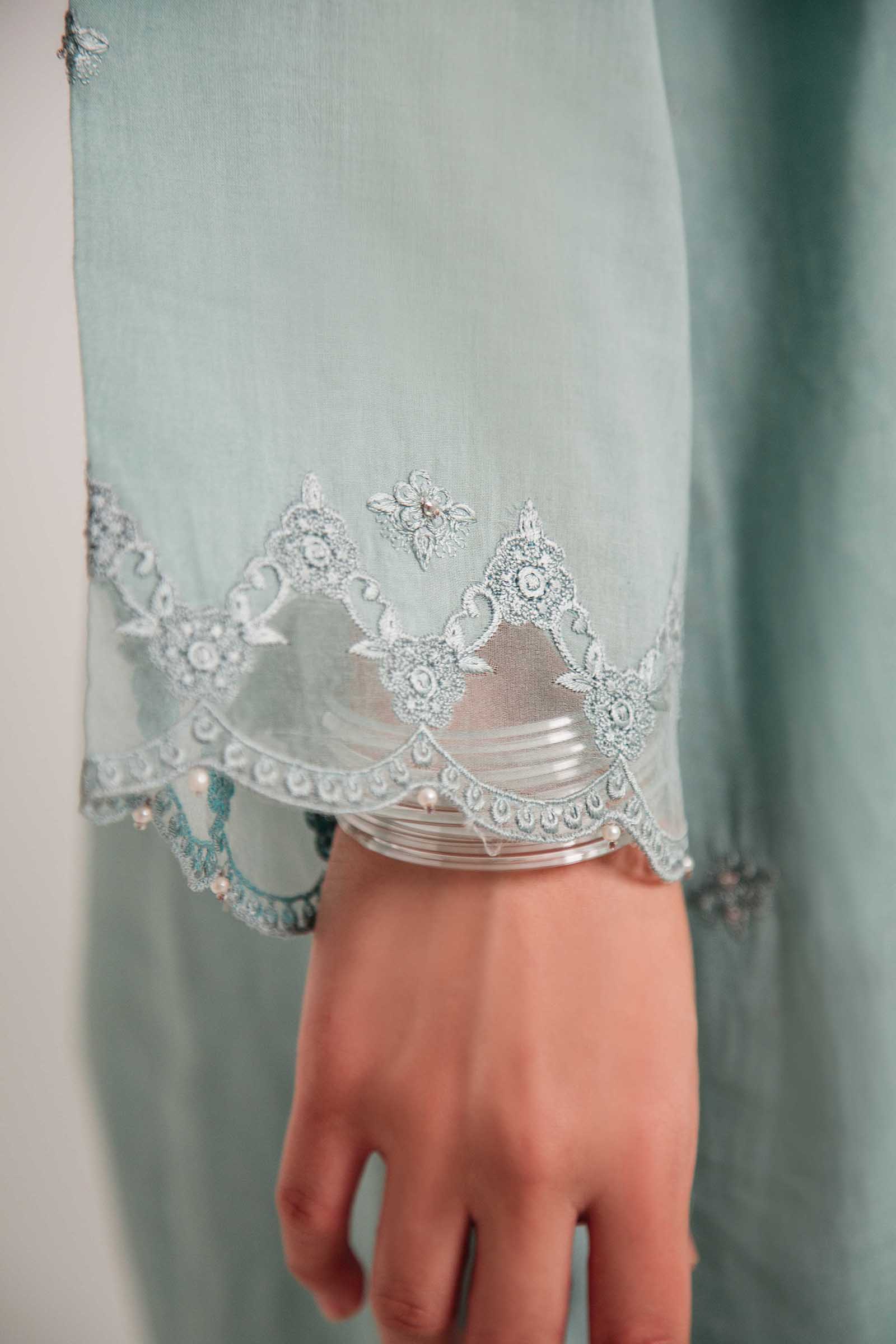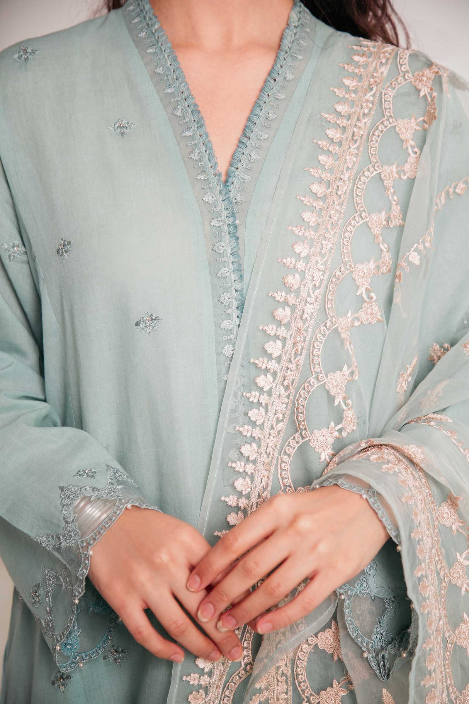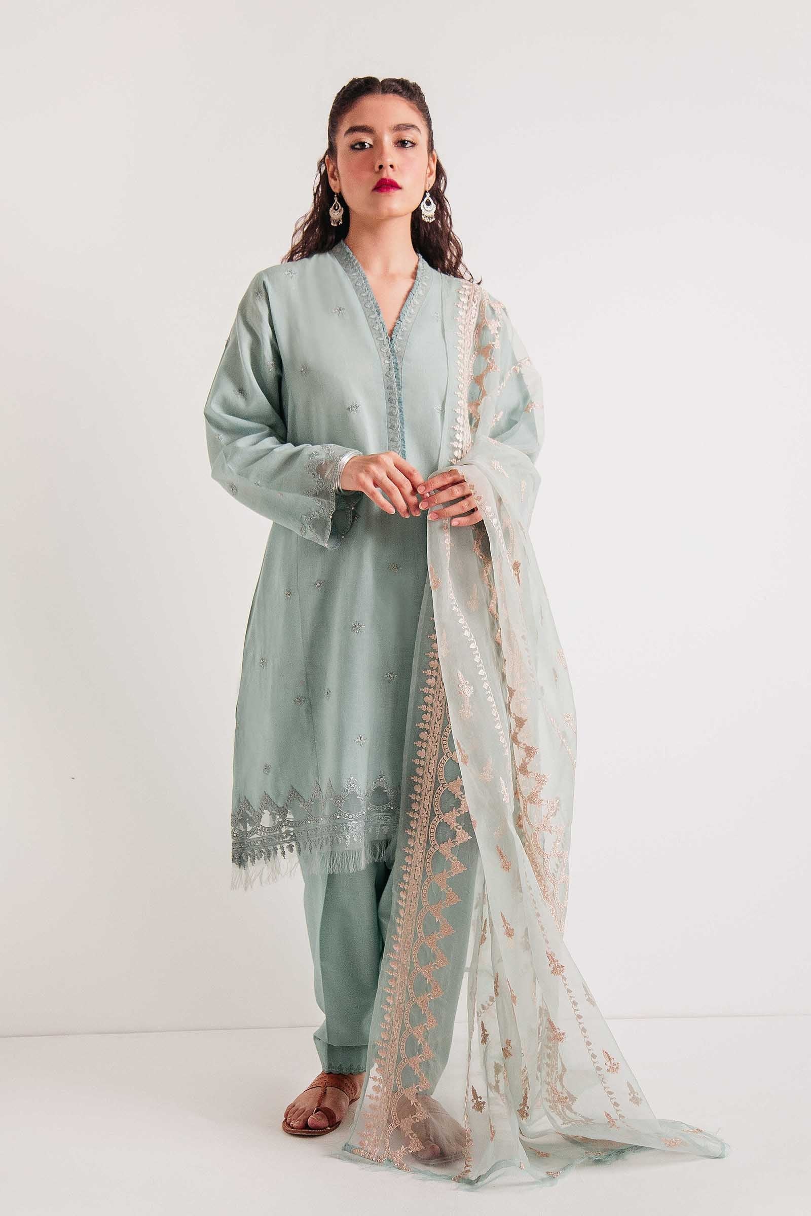 Pale turquoise loose fit kurta with embroidery all over and an intricate neckline detail, paired with a shalwar and an embroidered dupatta.