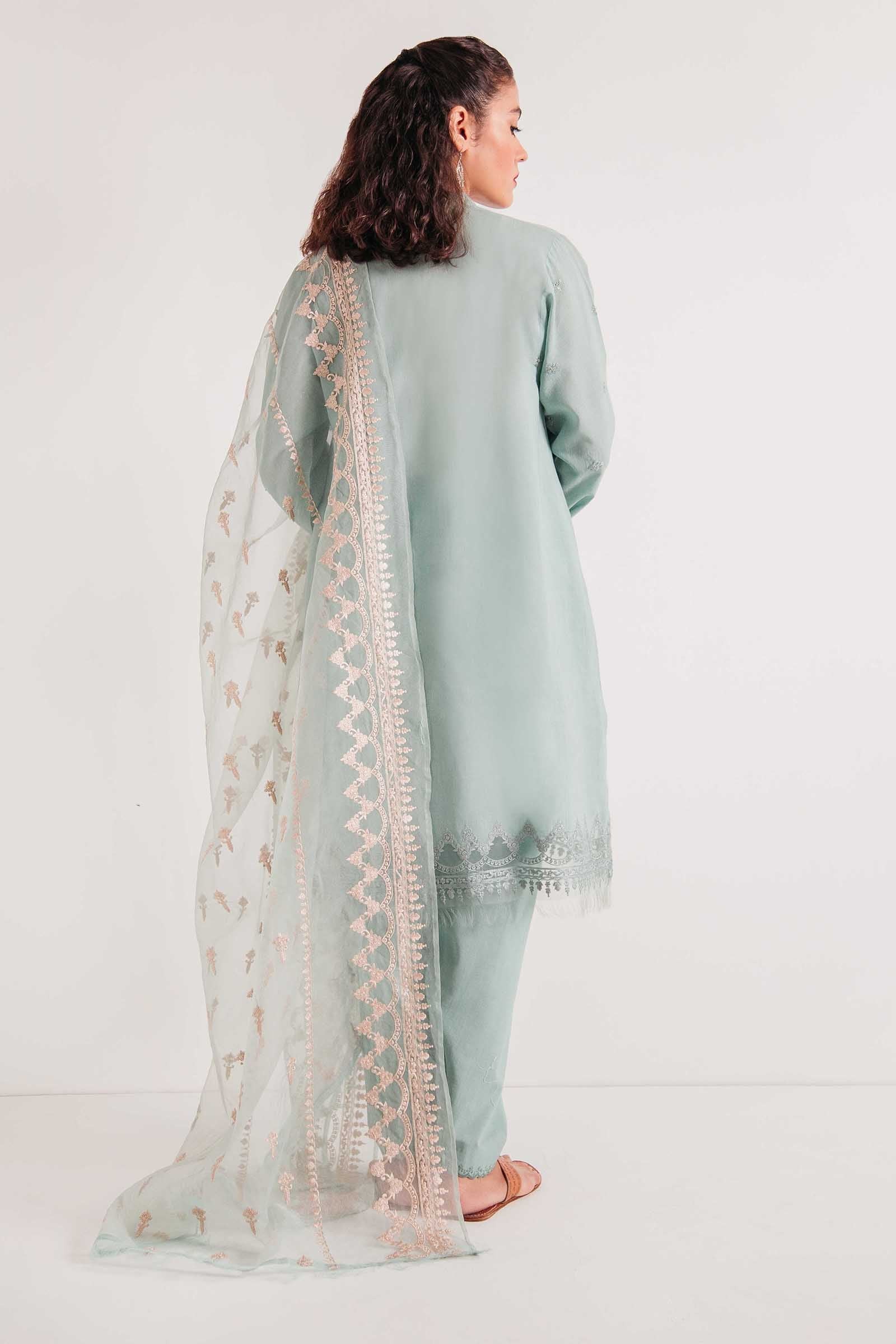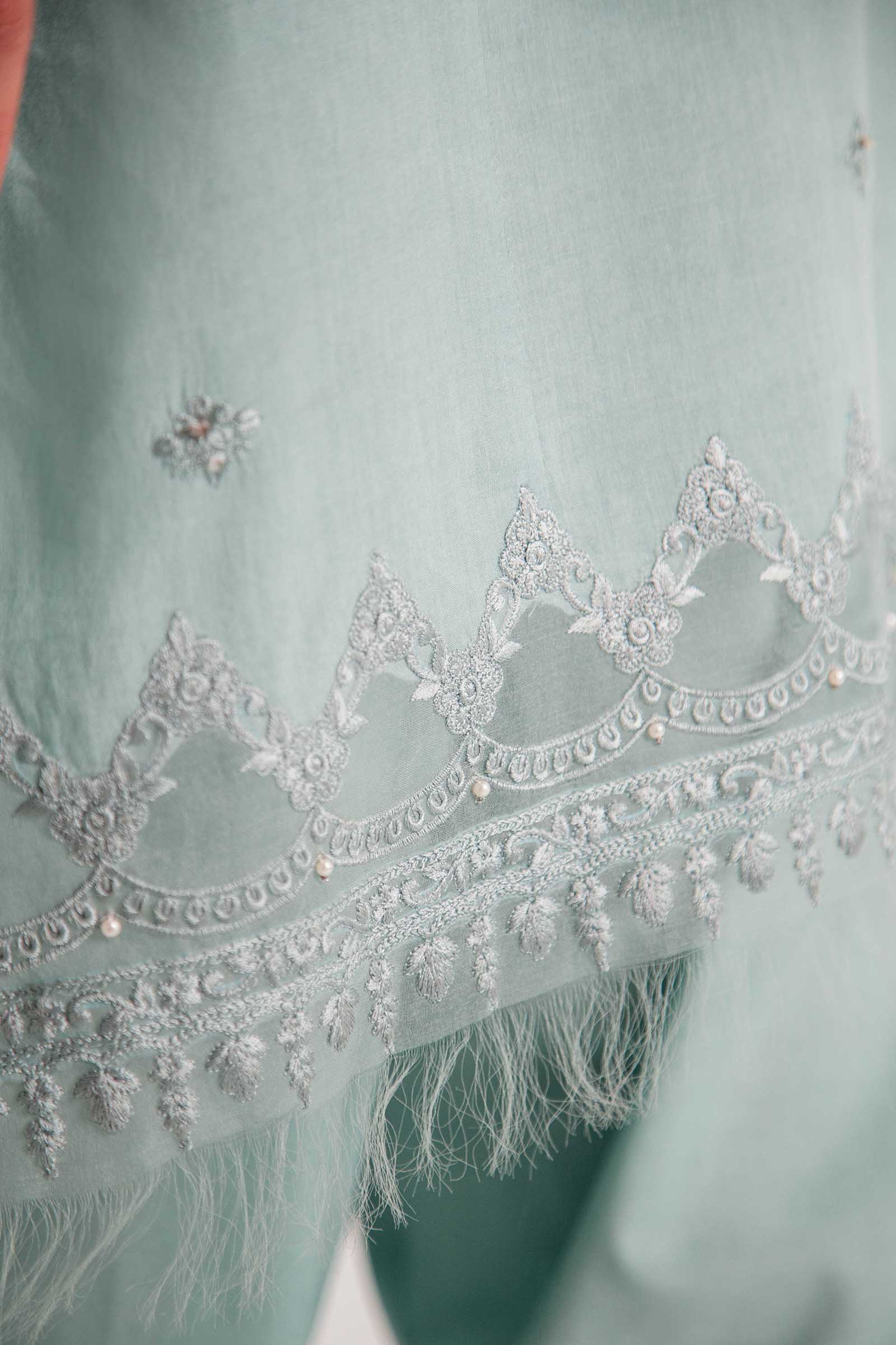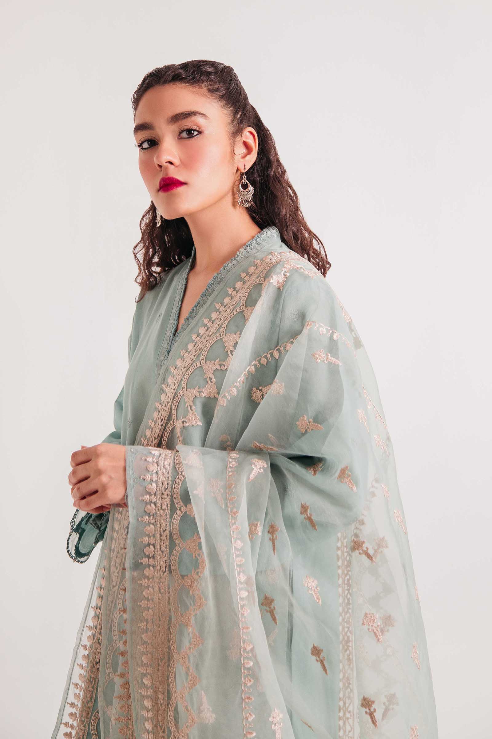 Pale turquoise loose fit kurta with embroidery all over and an intricate neckline detail, paired with a shalwar and an embroidered dupatta.