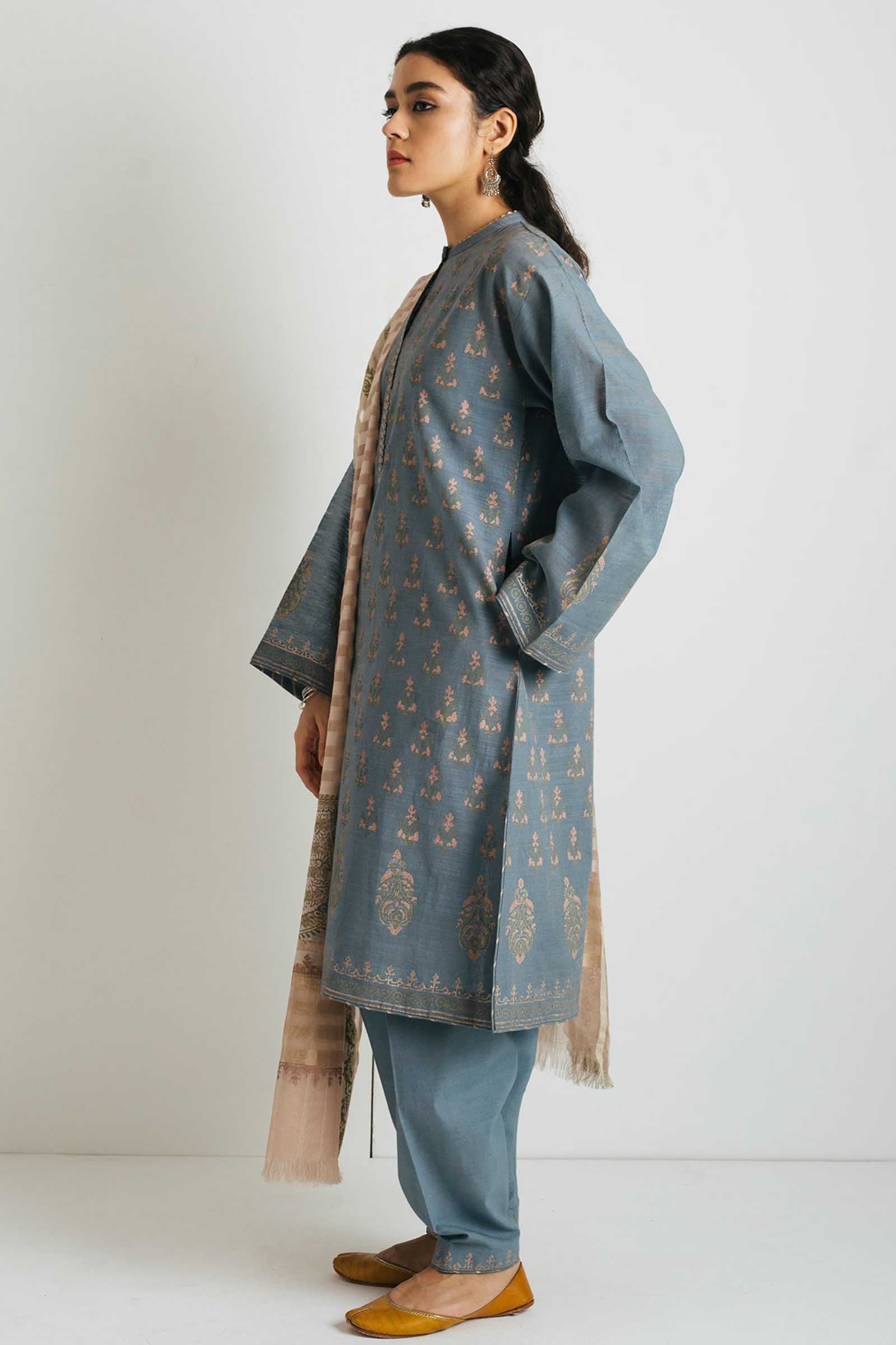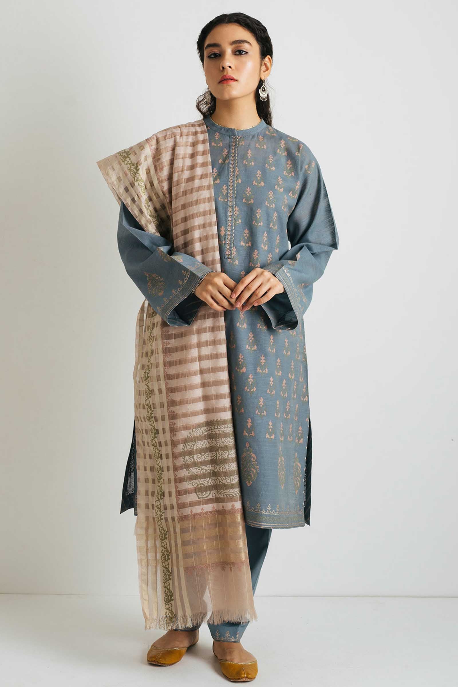 Blue loose-fit block printed kurta with delicately embroidered neckline paired with our classic block printed shalwar and a mauve block printed dupatta