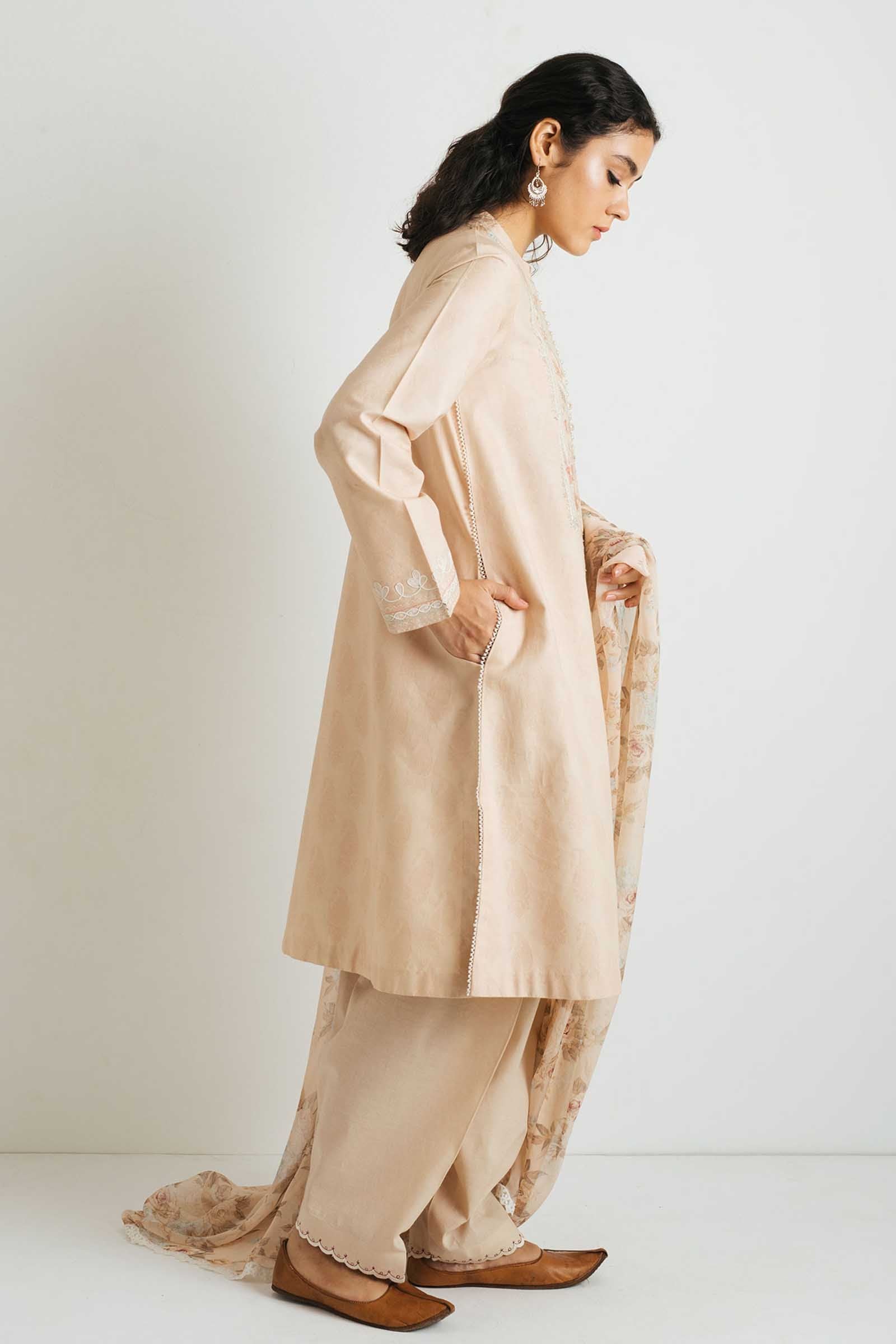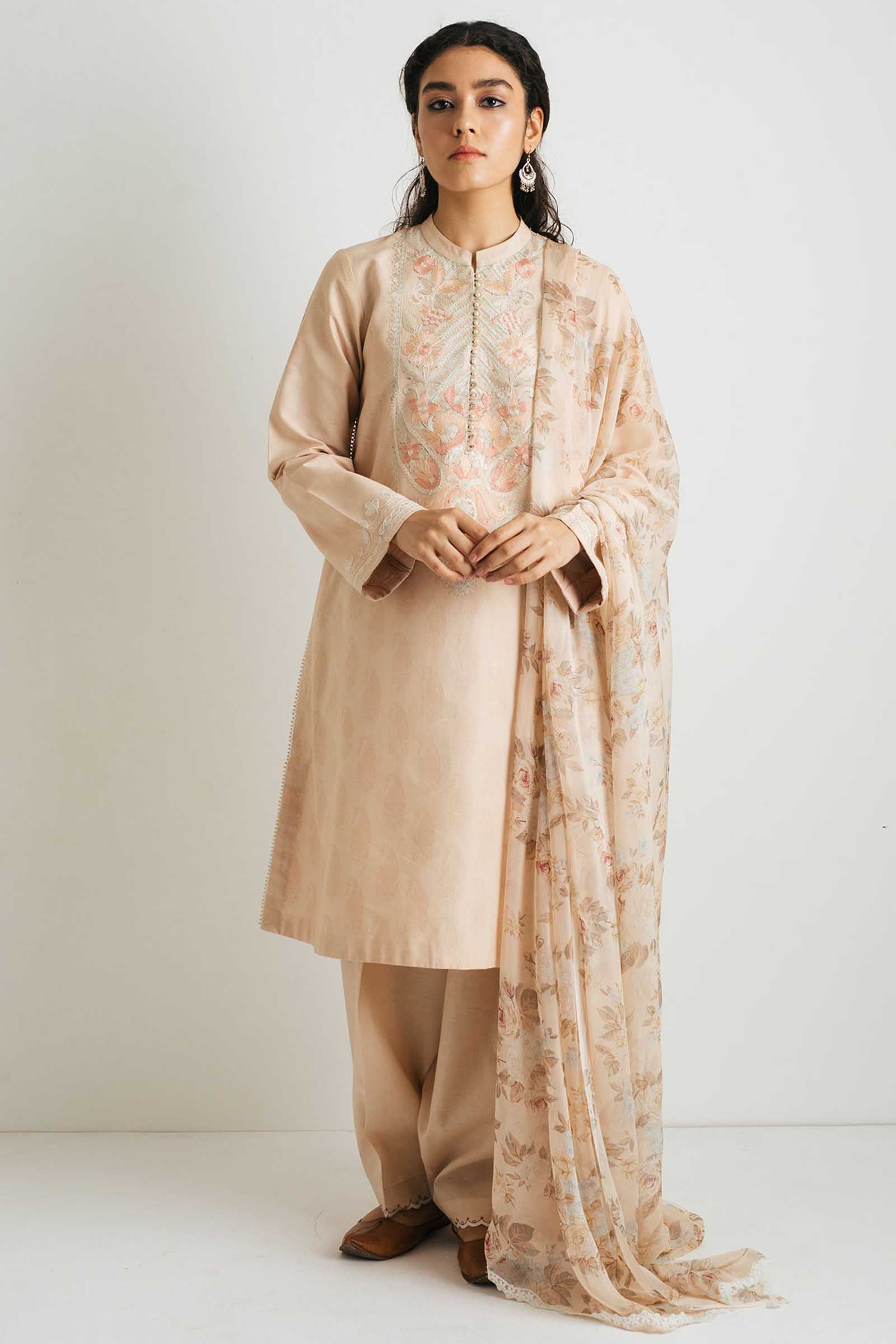 Nude, regular-fit kurta with a beautiful embroidered floral neckline in aari stitch, paired with a floral printed dupatta and a classic shalwar.