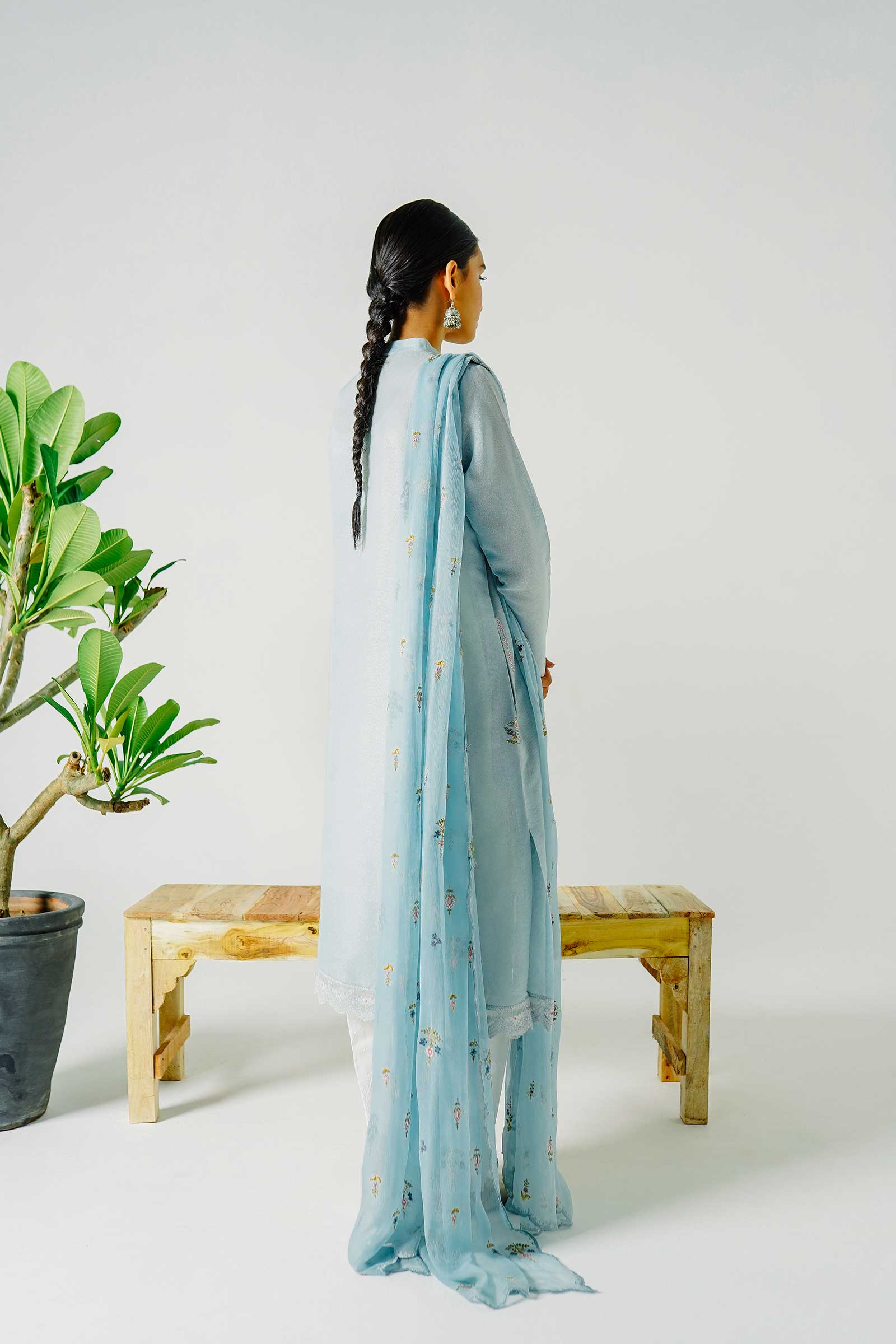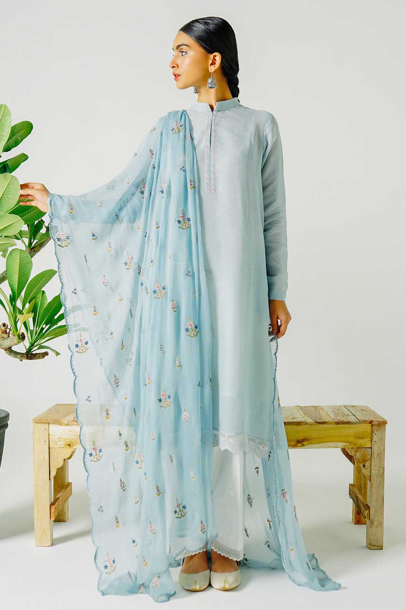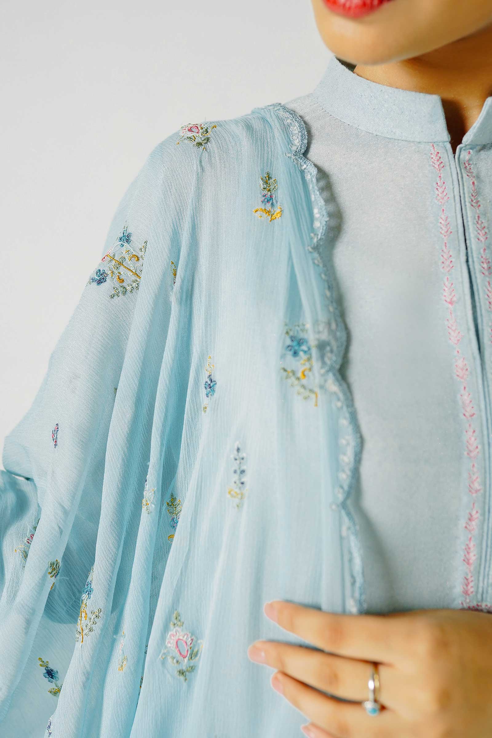 Ice blue kurta with embroidery details on neckline paired with an embroidered chiffon dupatta.