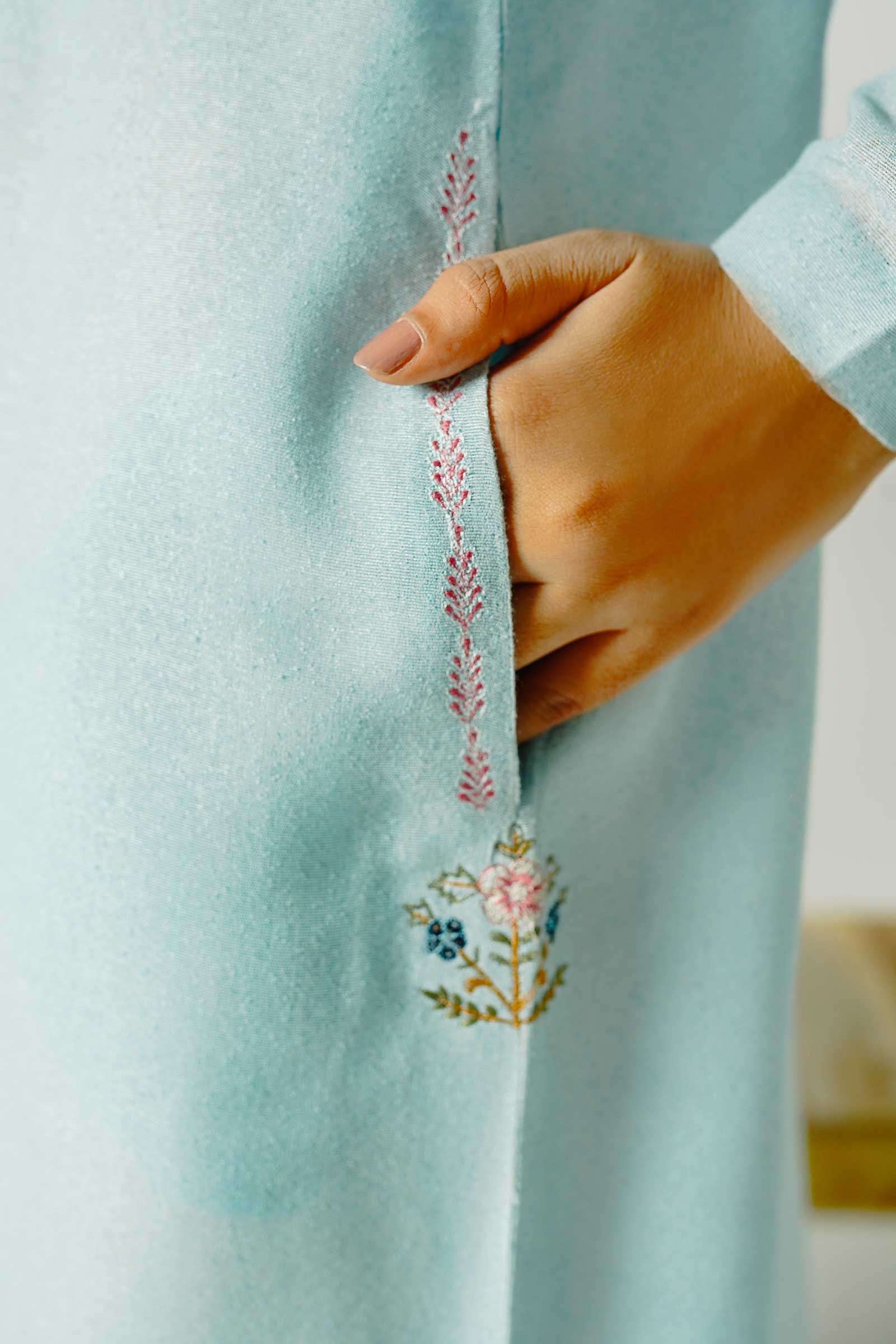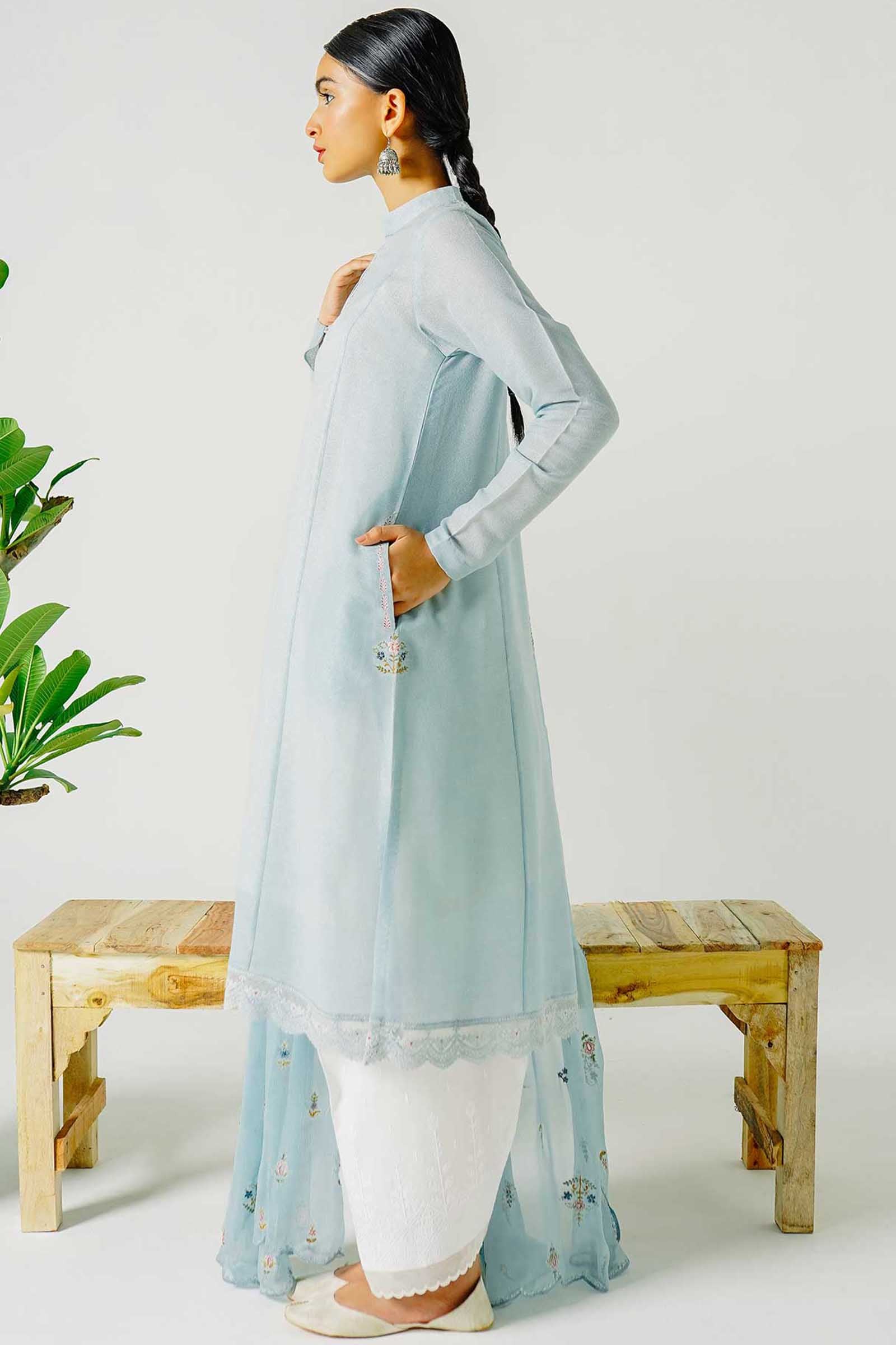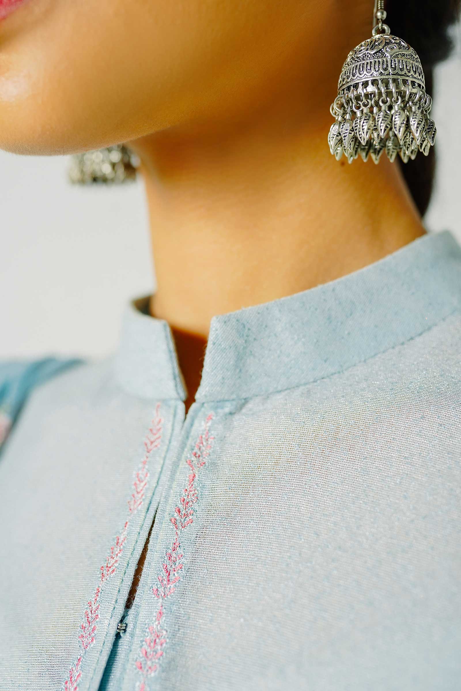 Ice blue kurta with embroidery details on neckline paired with an embroidered chiffon dupatta.