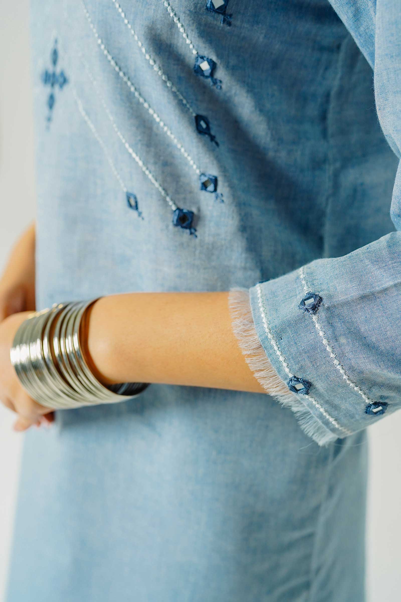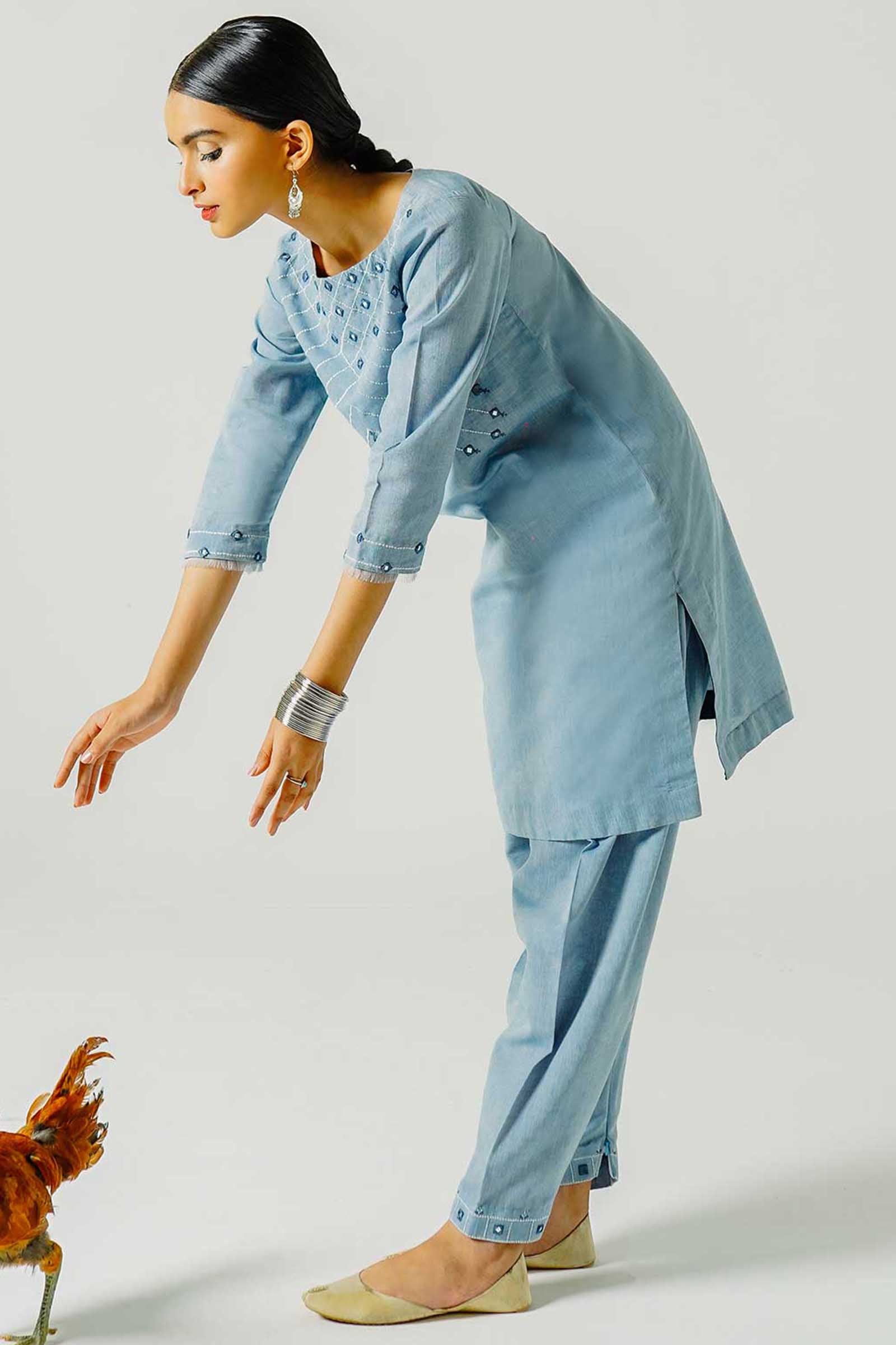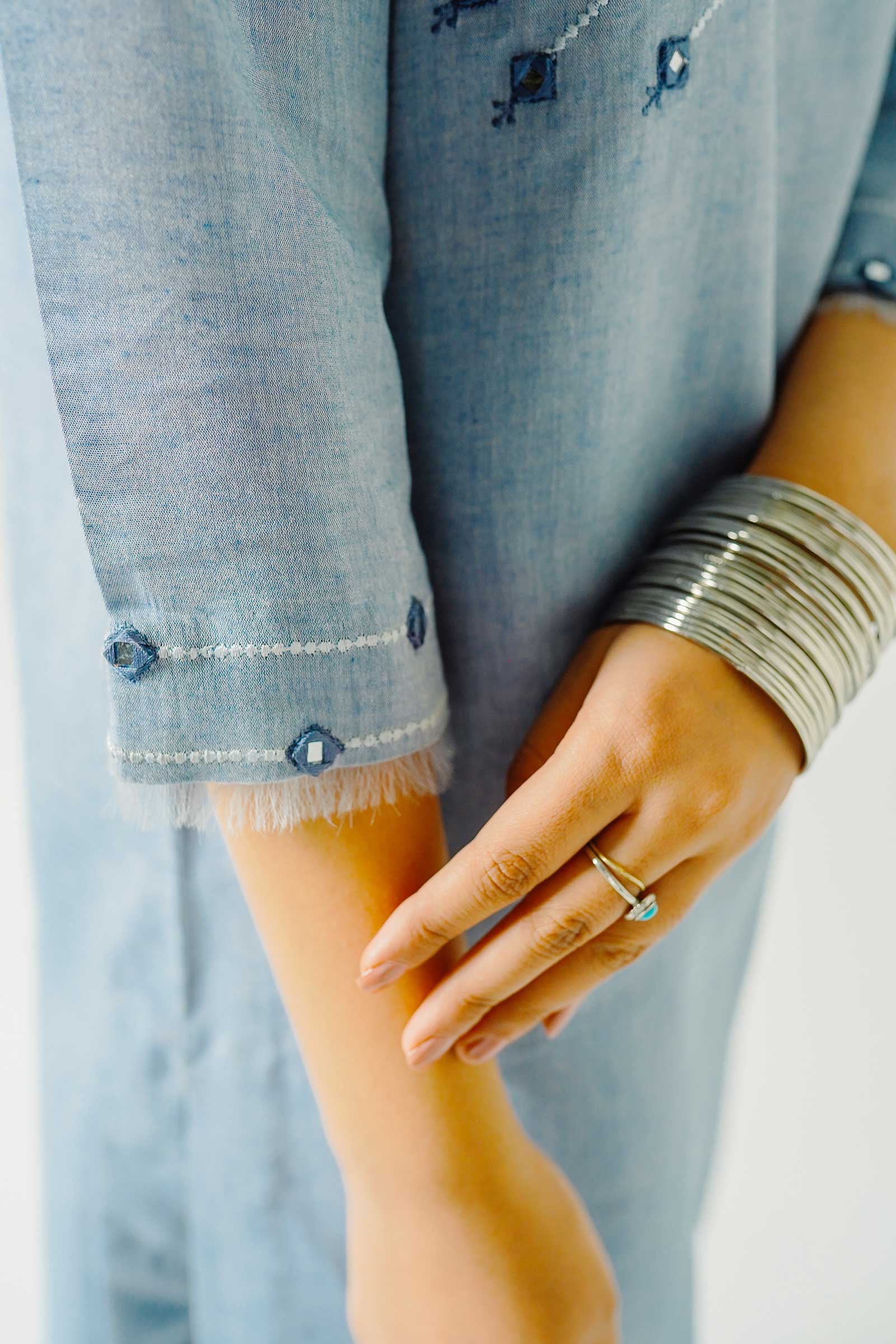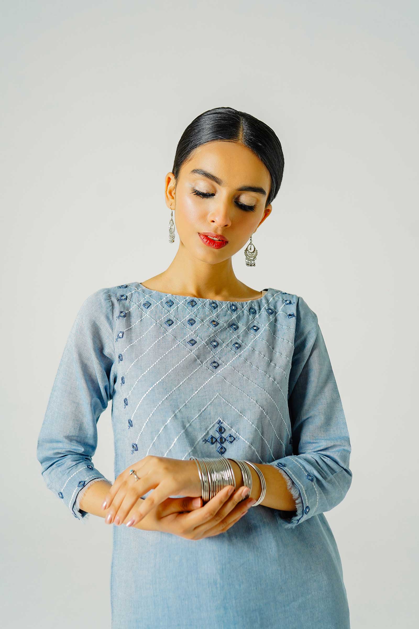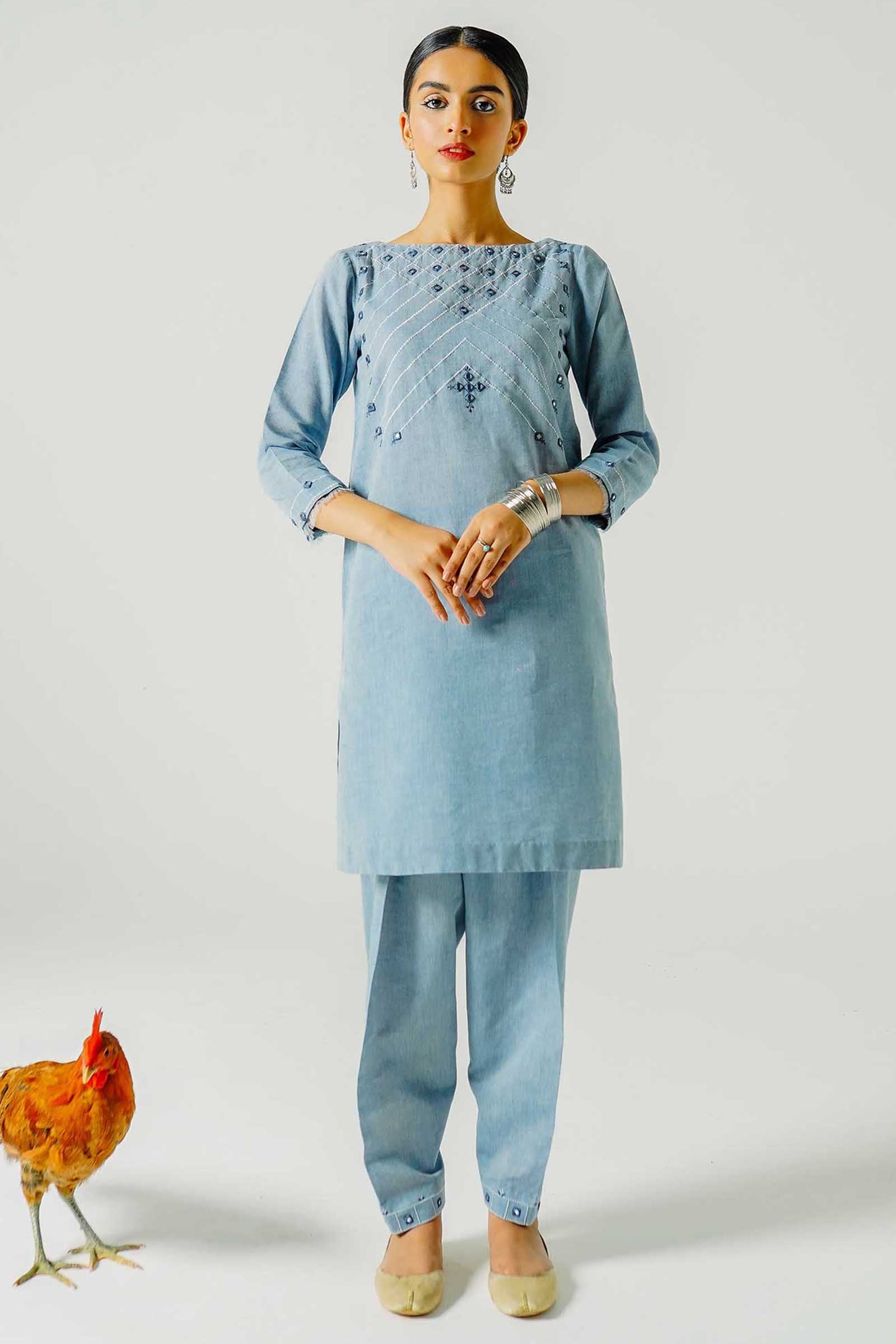 Straight-fit kurta embellished with sheesha embroidery, and paired with an embroidered shalwar.