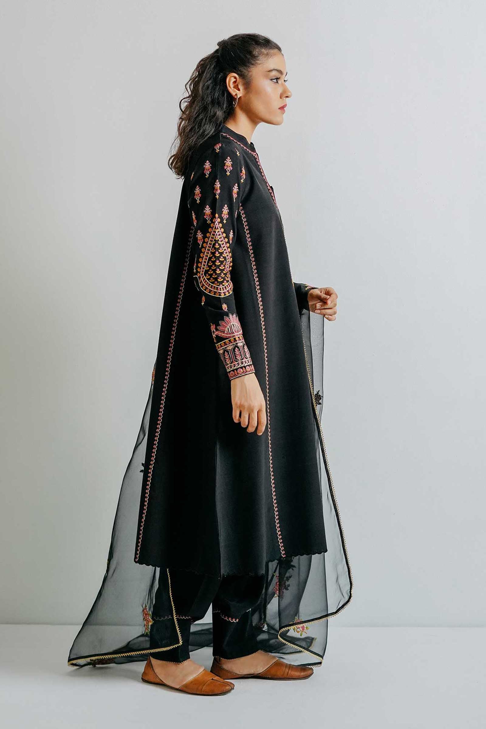 Black embroidered paneled kurta with customized embroidery on sleeves, paired with a shalwar and an organza dupatta.