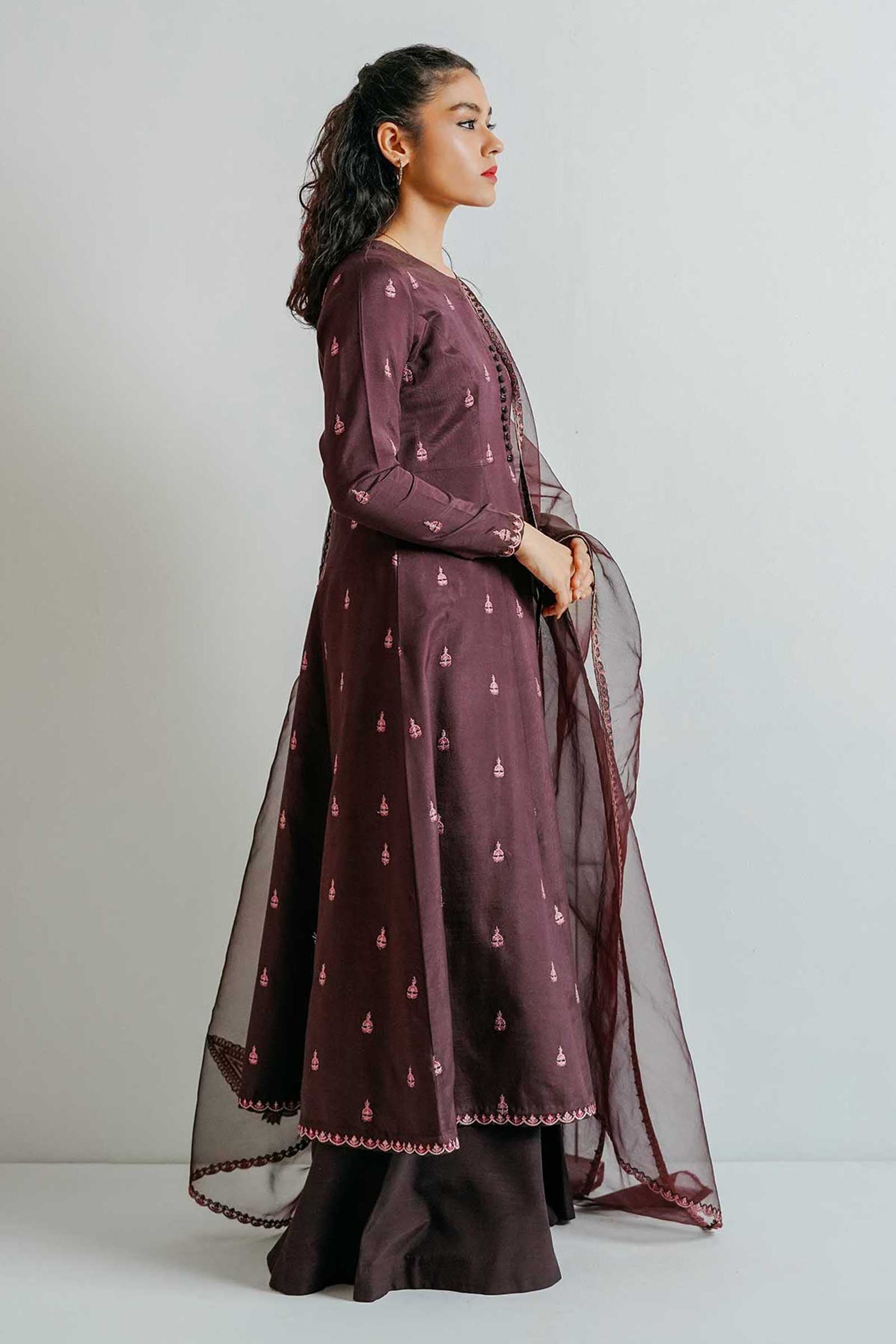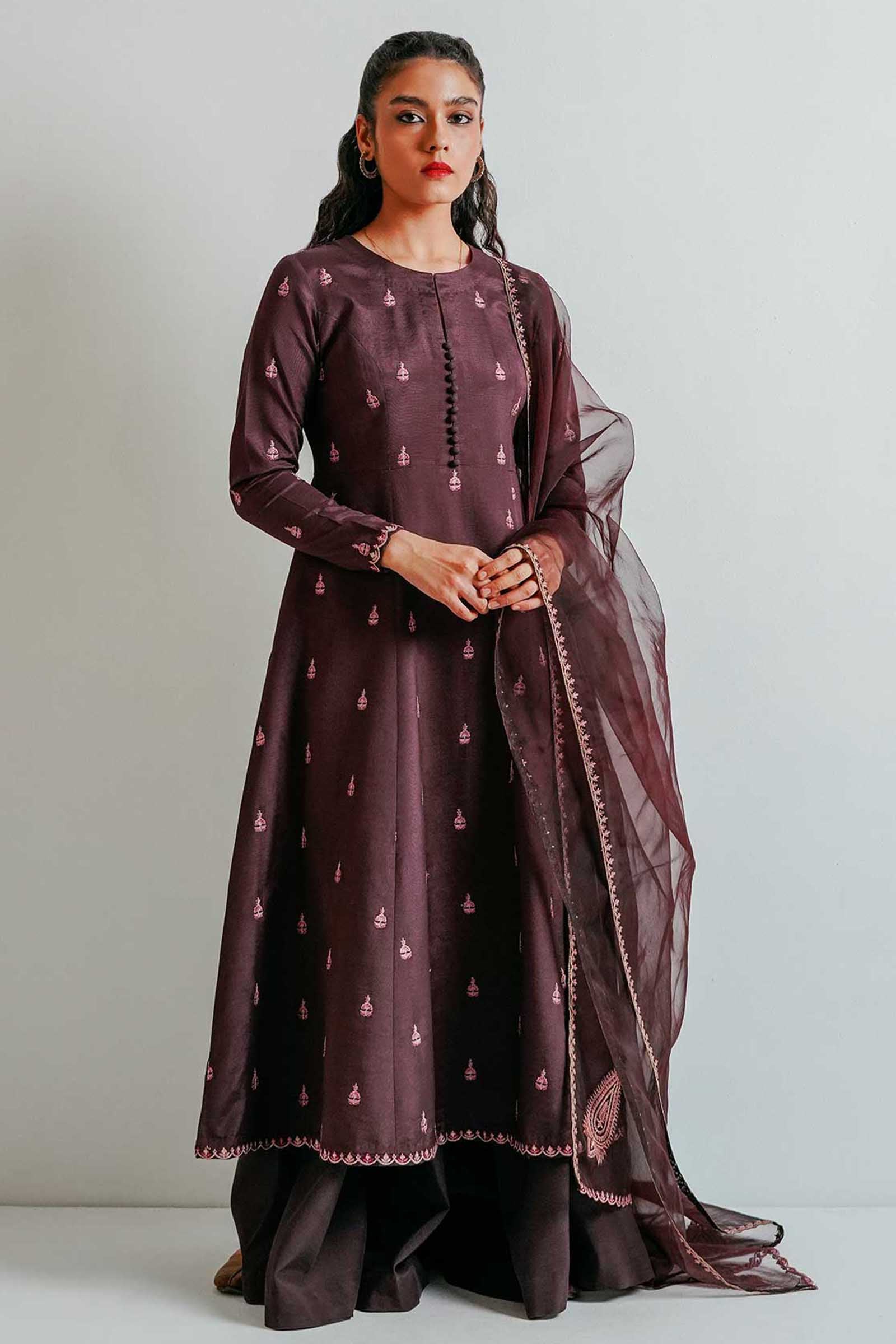 Cedar brown flared panalled kurta with emdoirdery spray all over, paired with sharara pants and embroidered organza dupatta.