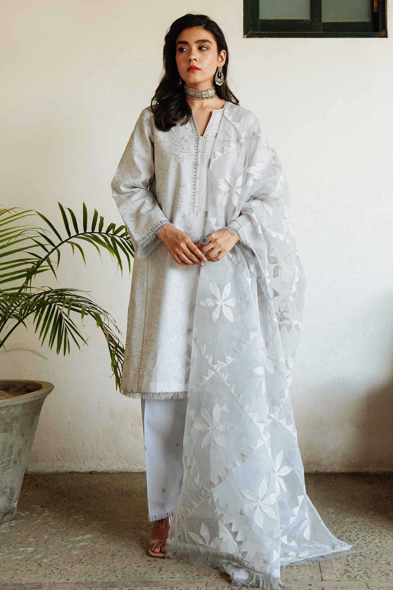 Steel blue loose-fit embroidered kurta, paired with an embroidered shalwar and our customized ralli dupatta