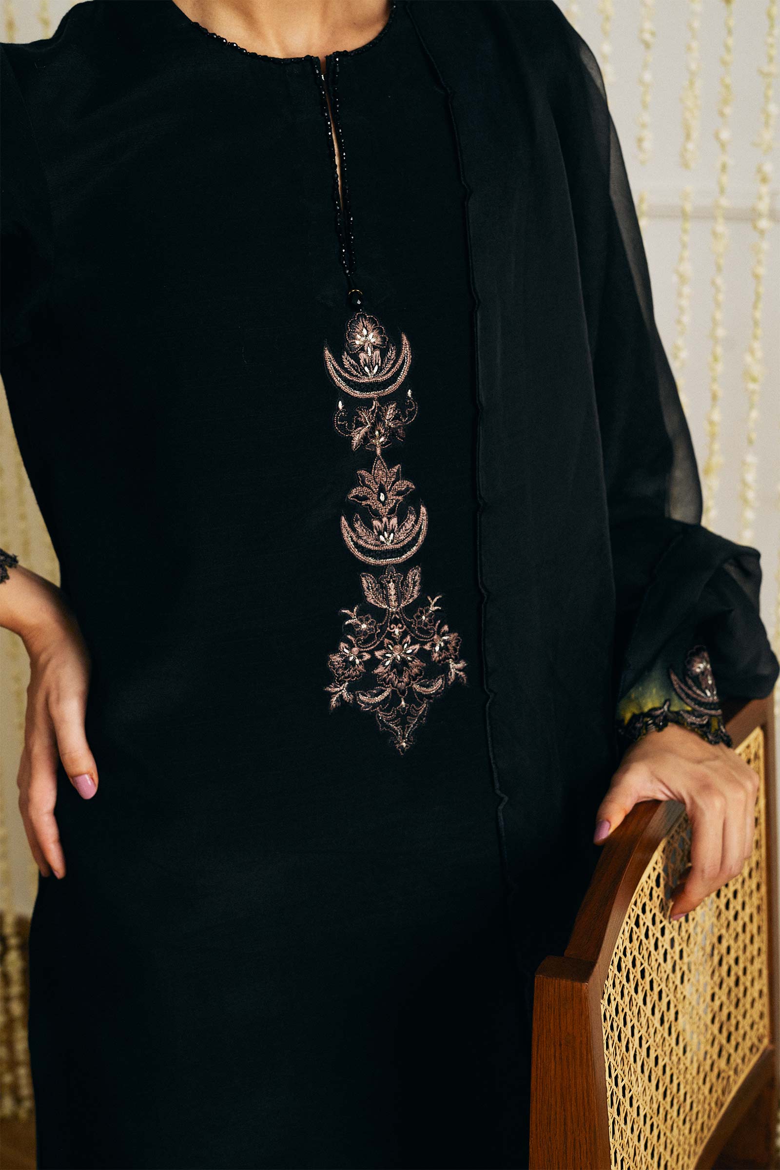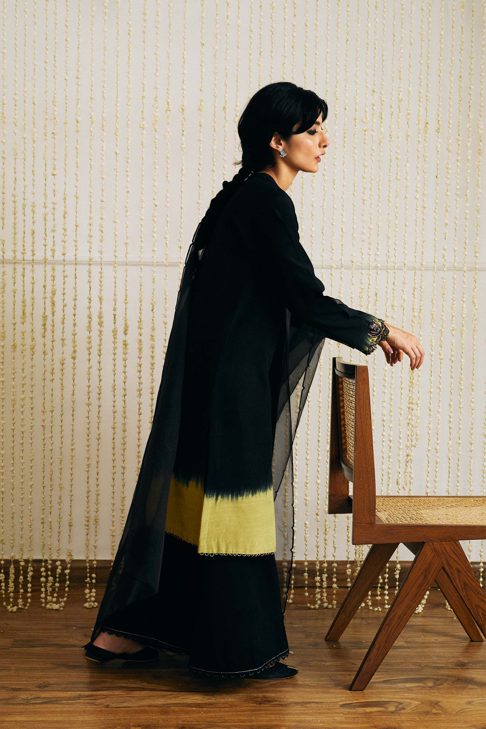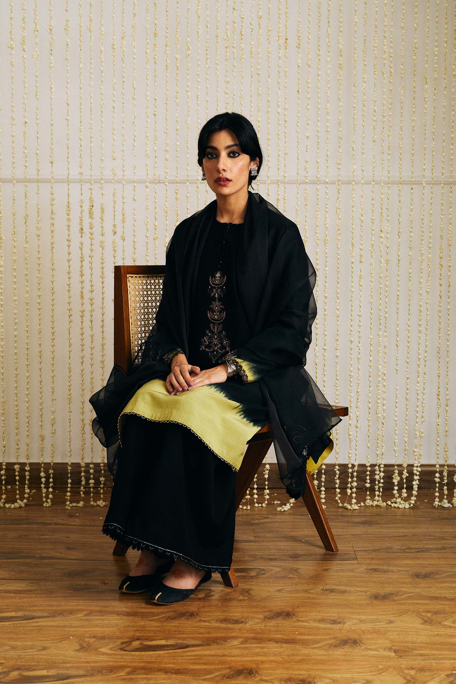 Black loose-fit shirt dip dyed on the hemline, enhanced with black and dull gold tilla embroidery on the front and sleeves, paired with a flared pant and a dupatta finished with applique on the corners.