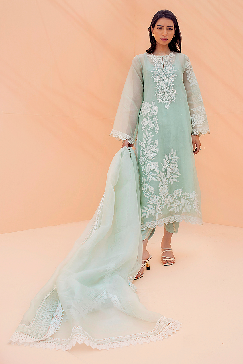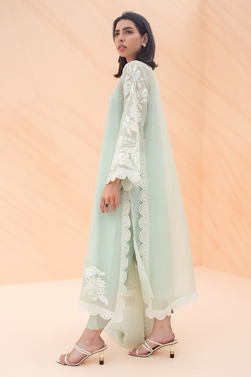 This mint organza shirt exudes understated elegance. Thoughtfully crafted using a variety of techniques, it is detailed with a scallop border and floral embroidery. Complete the outfit with our signature SM cropped raw silk trousers for a simple yet striking look.