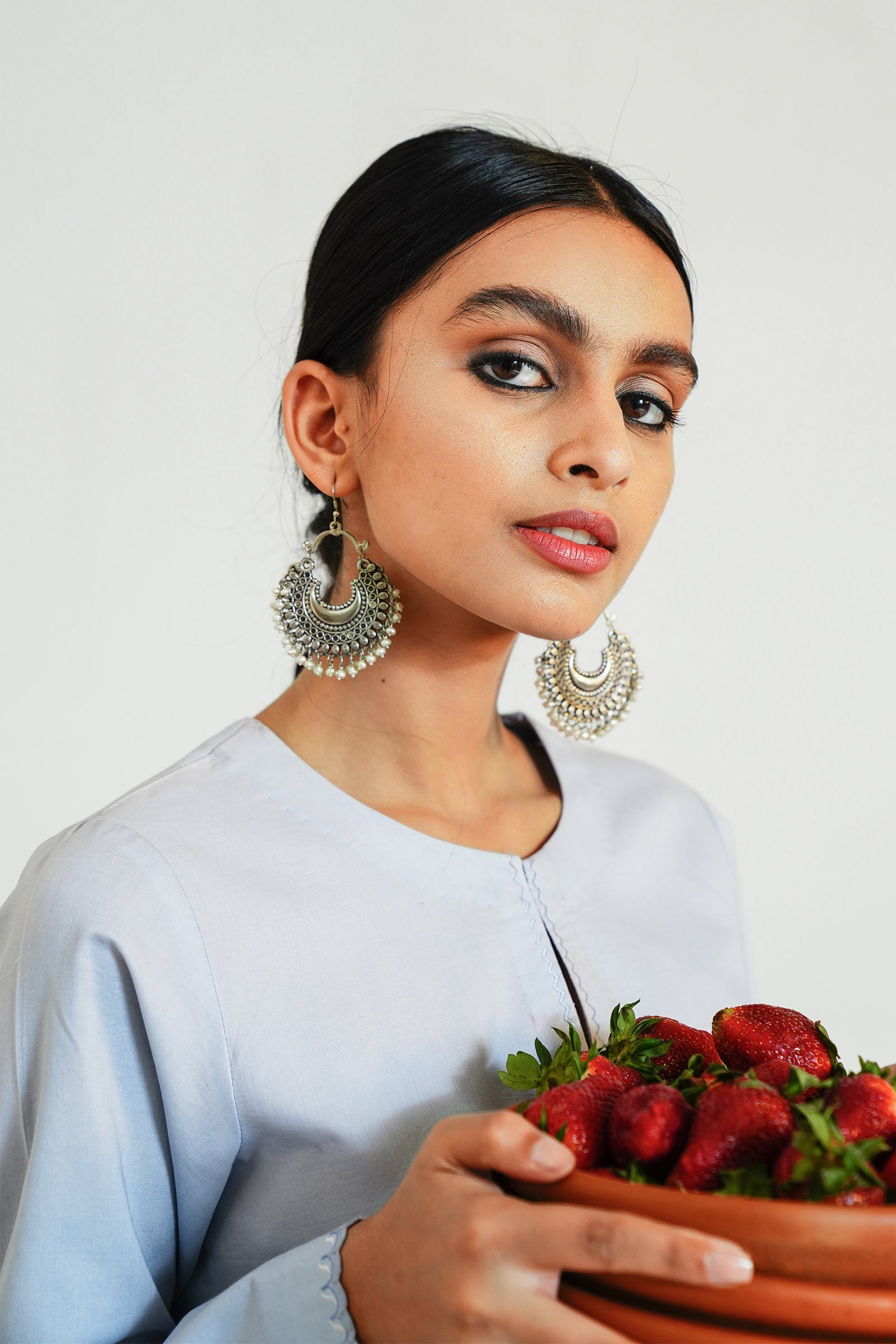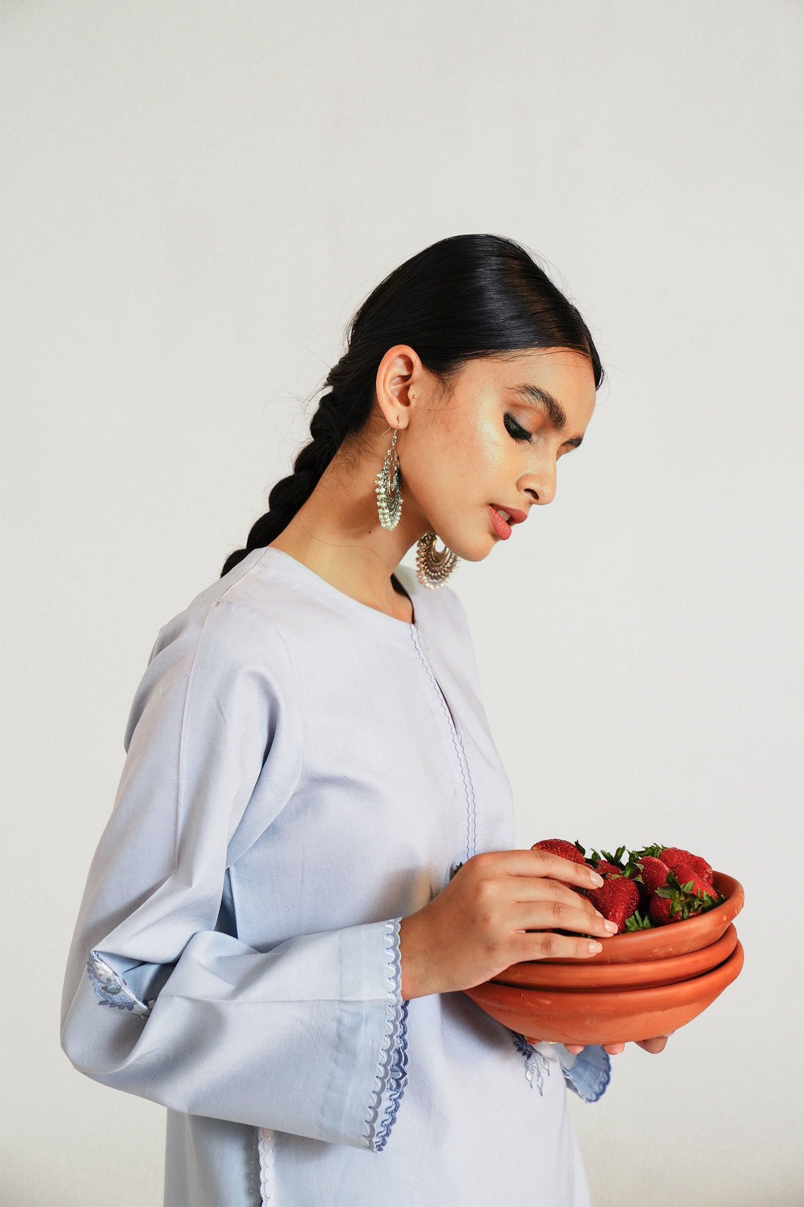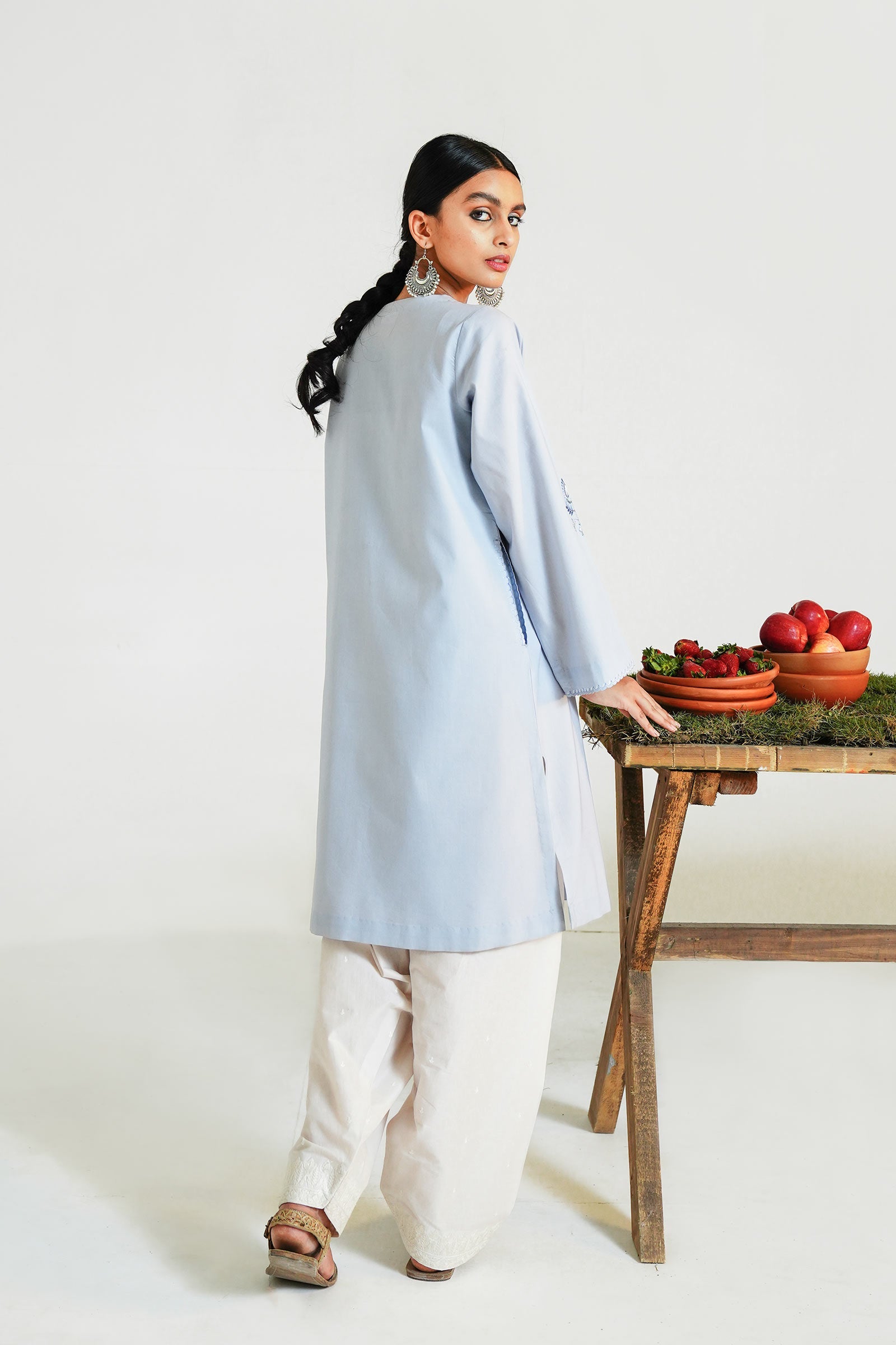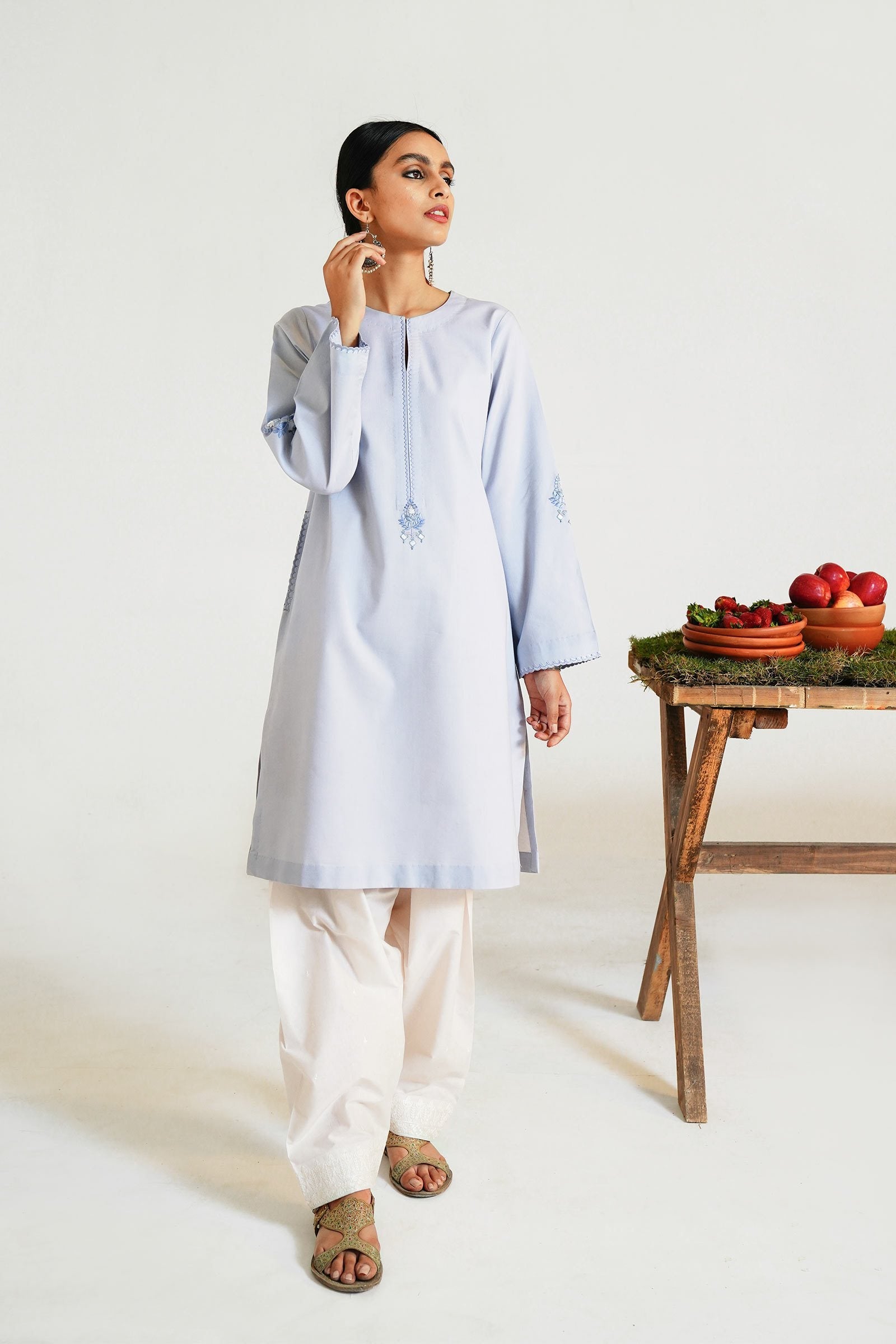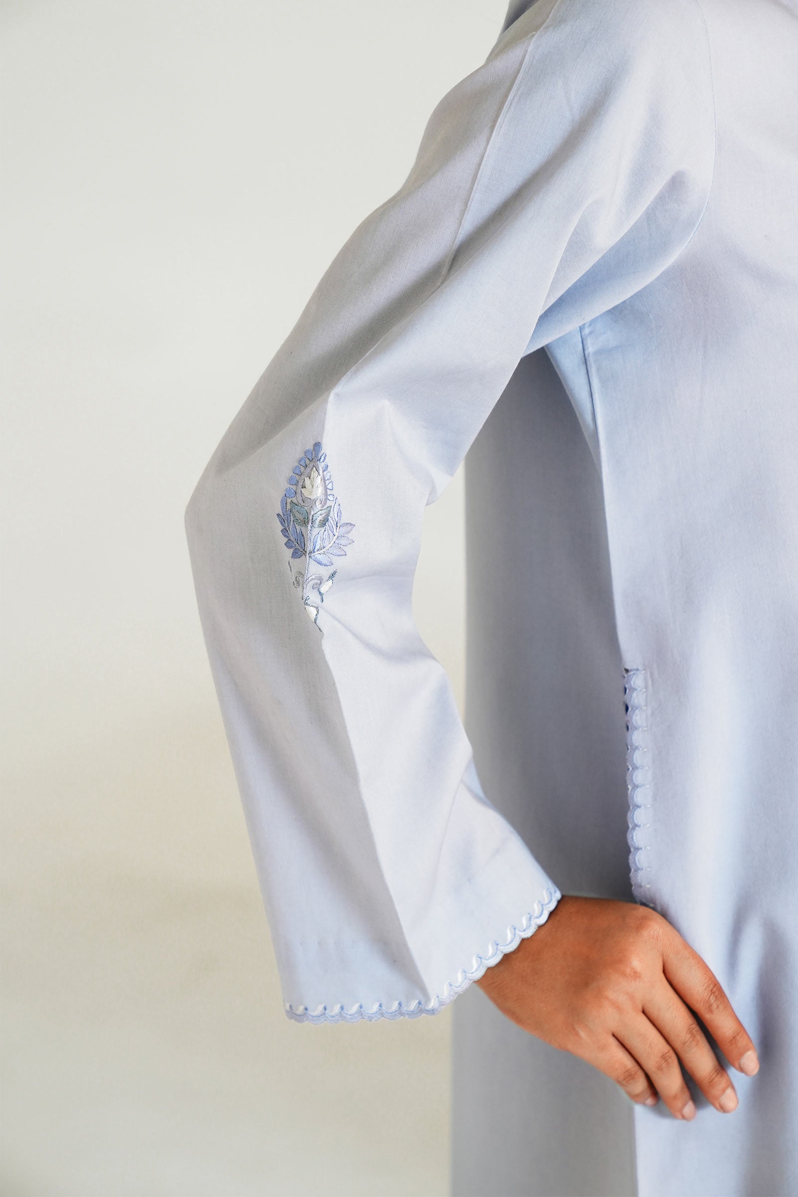 Baby blue loose-fit kurta with intricate sheesha details on neckline, pockets and sleeves.