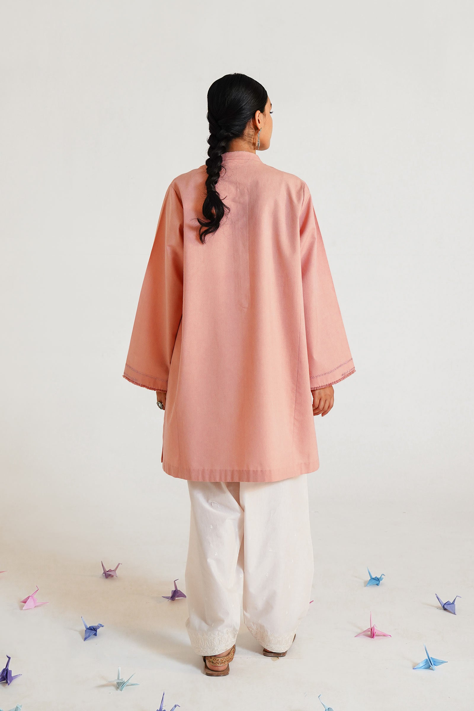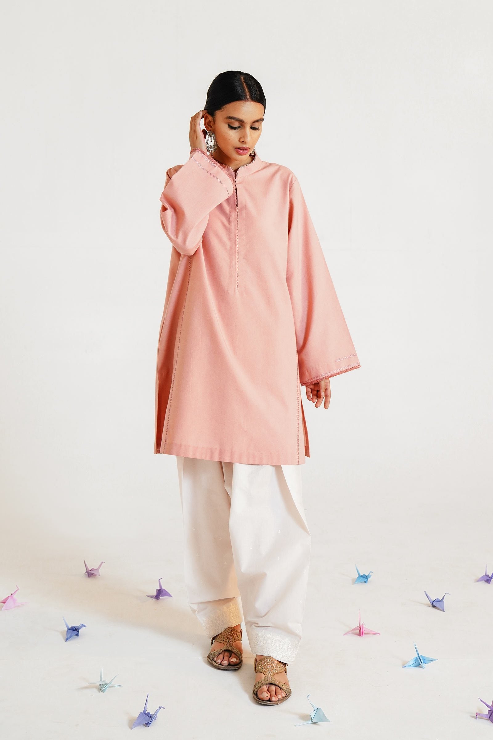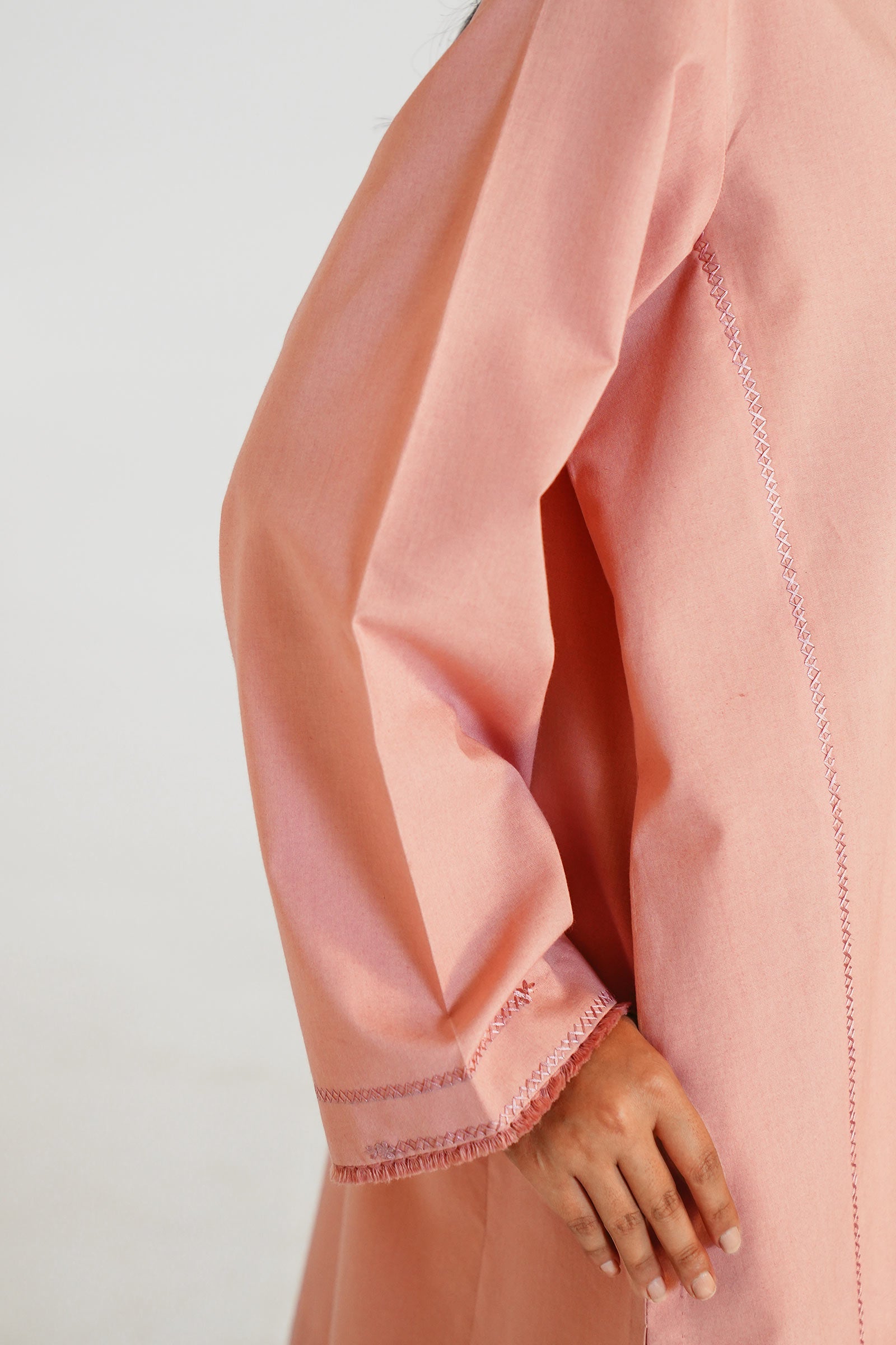 Chai pink lose fit kurta with hand stitch details on panels and sleeves.