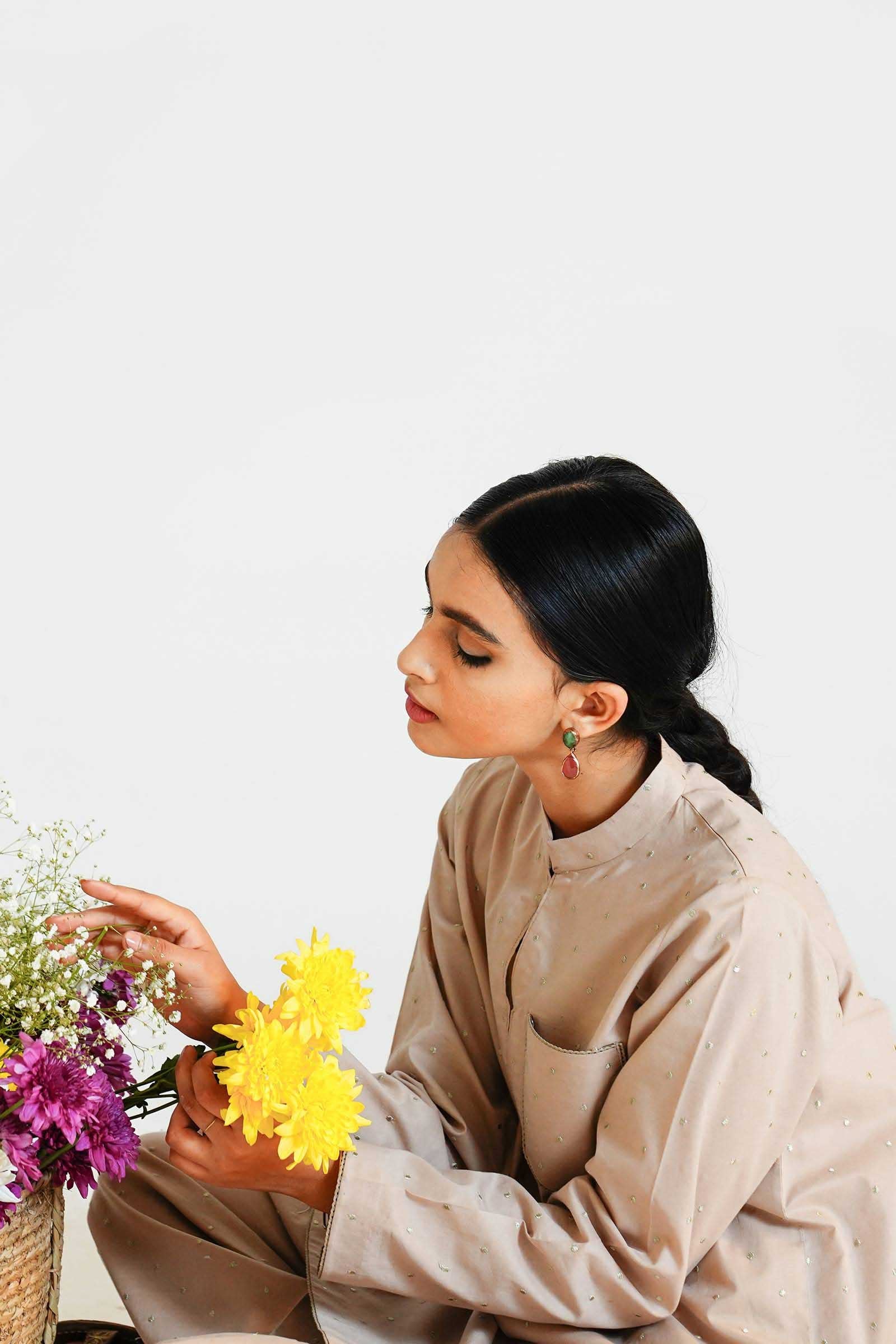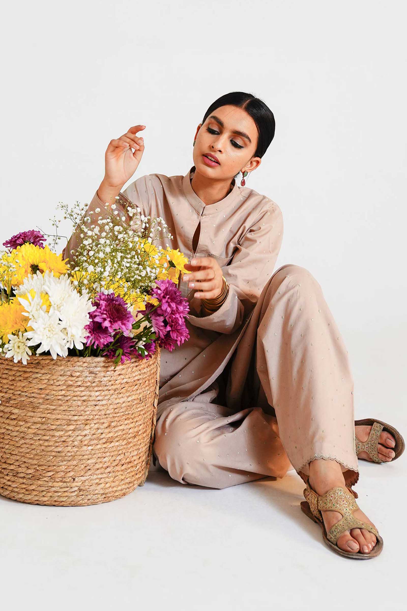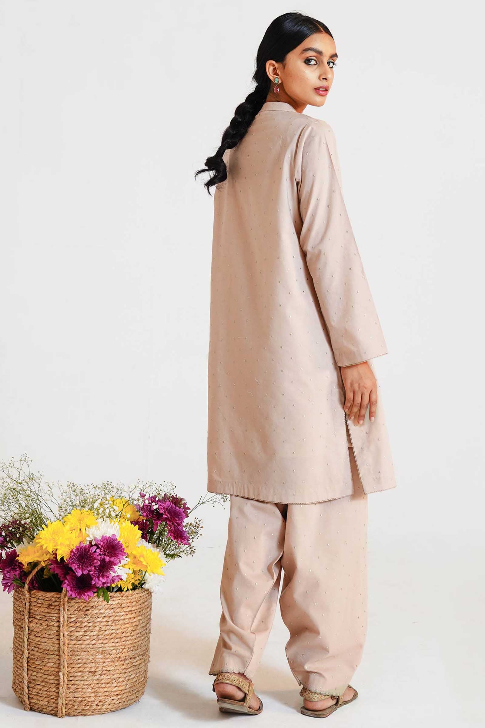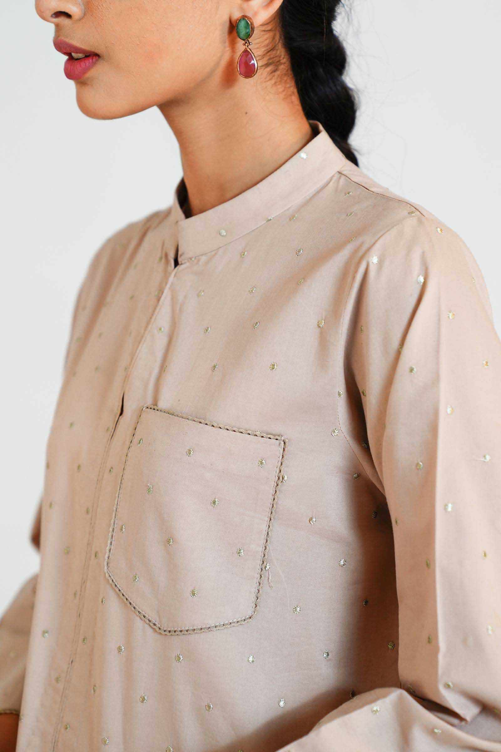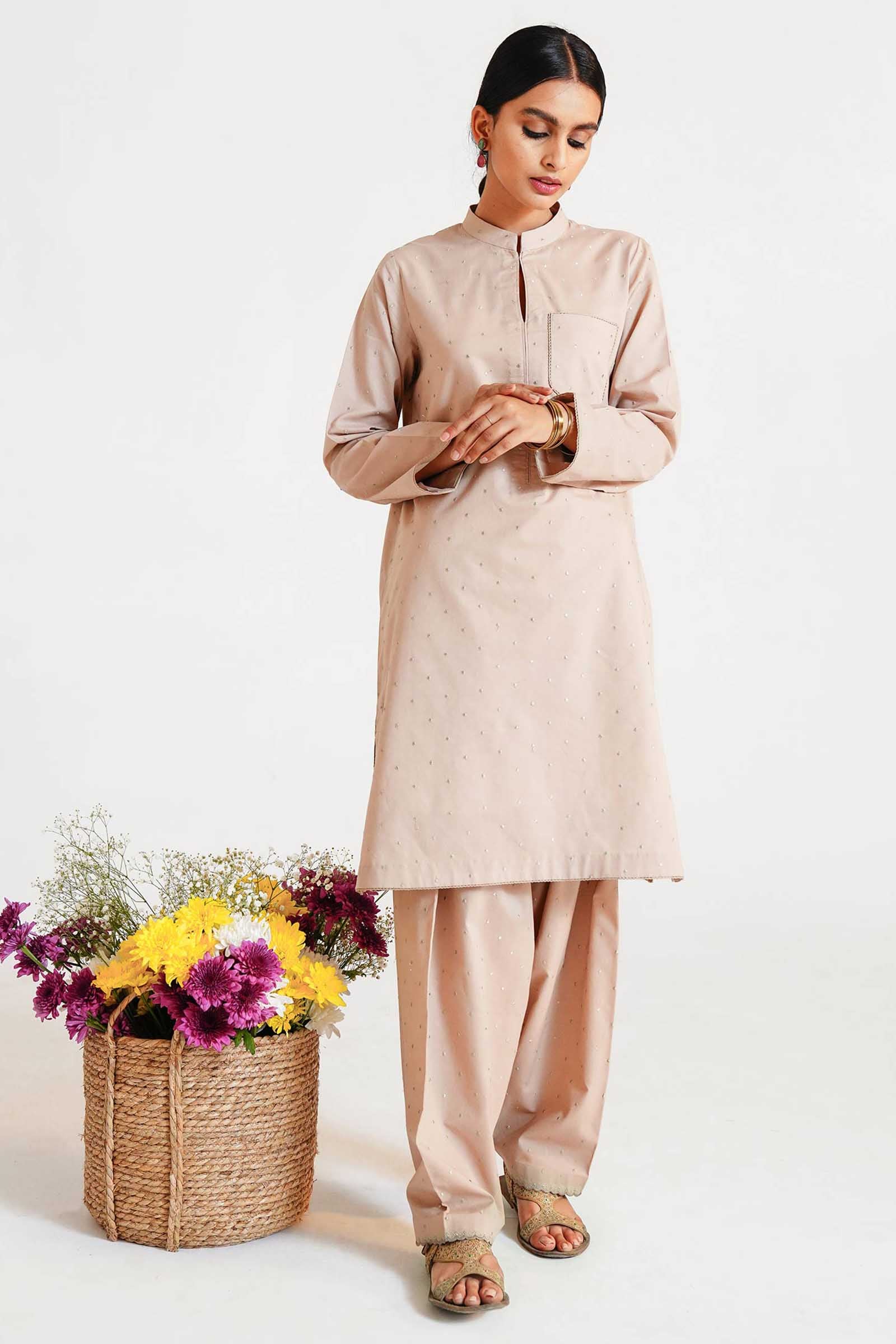 An oyster beige kurta with pockets, enhanced with tilla embroidered dots and paired with a matching shalwar.