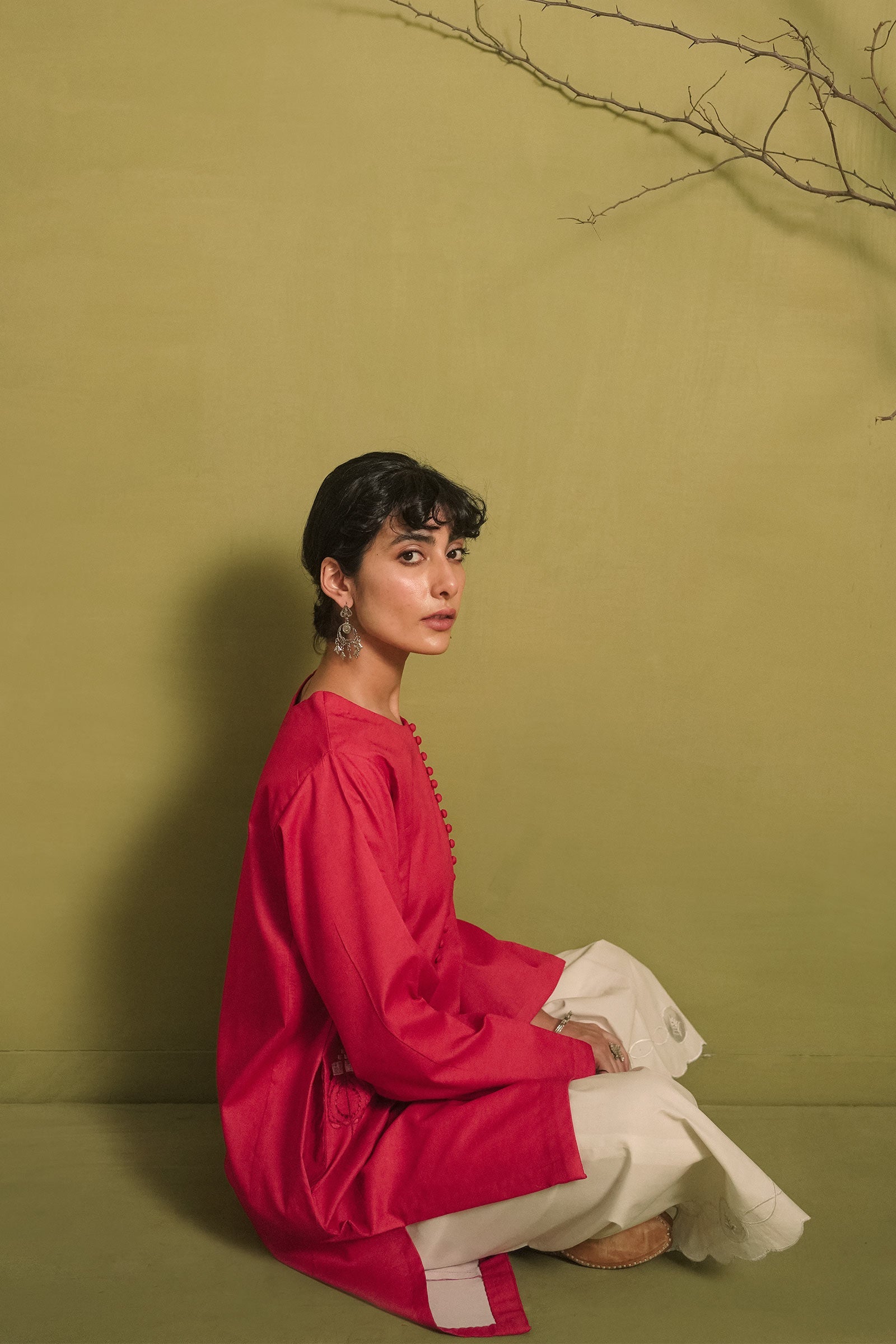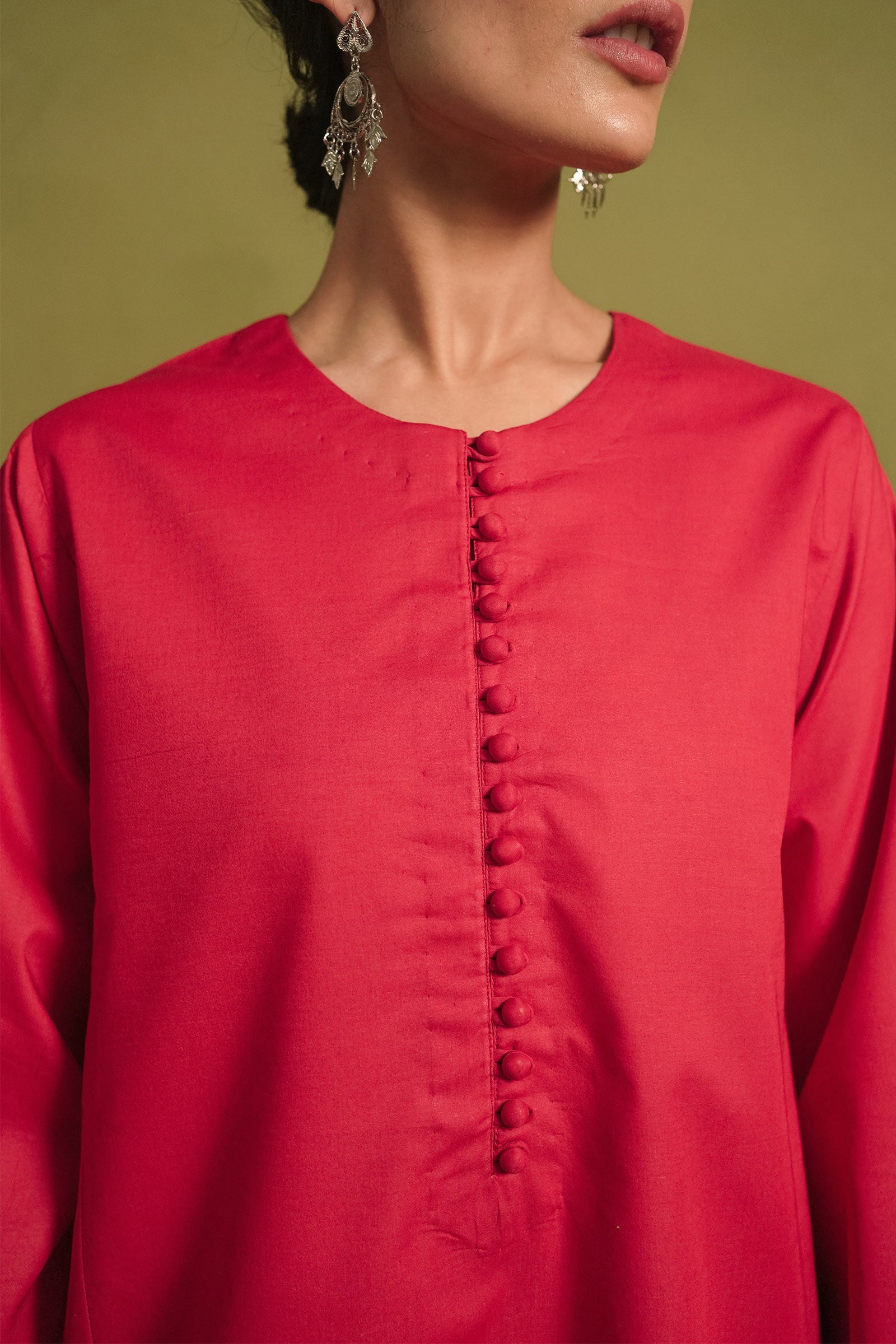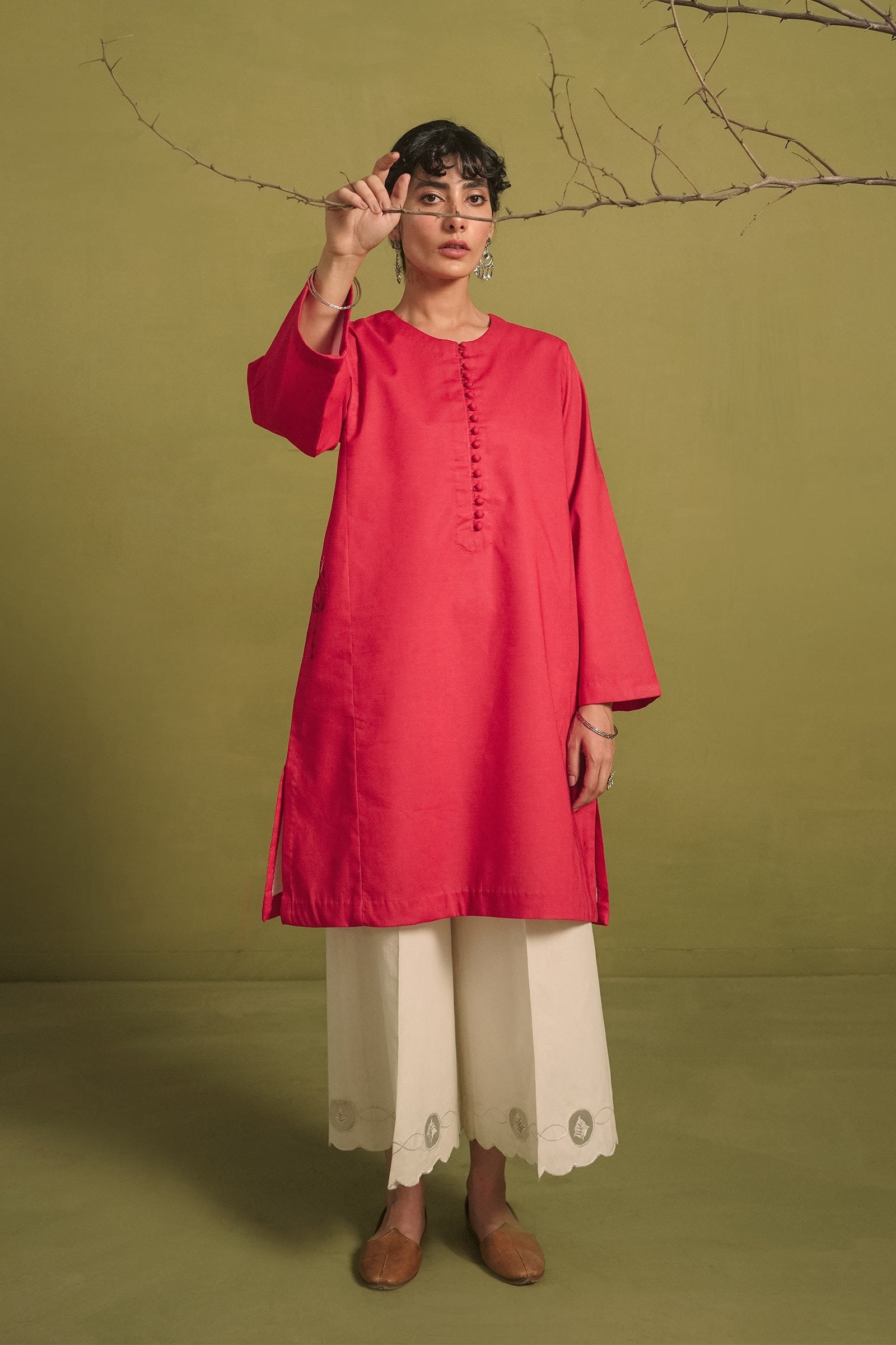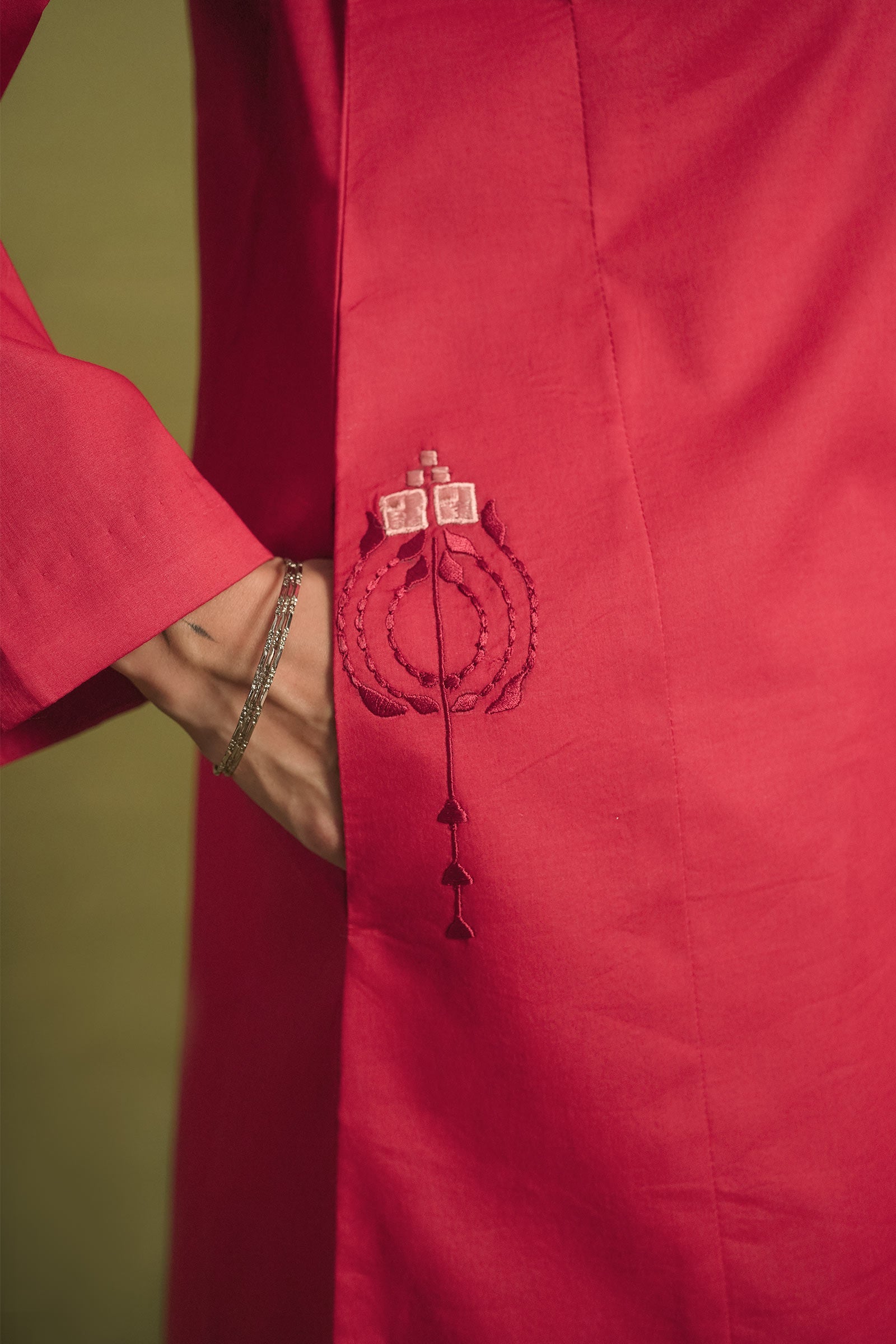 Paneled loose-fit kurta in crimson red, enhanced with two tone embroidery on pocket front.