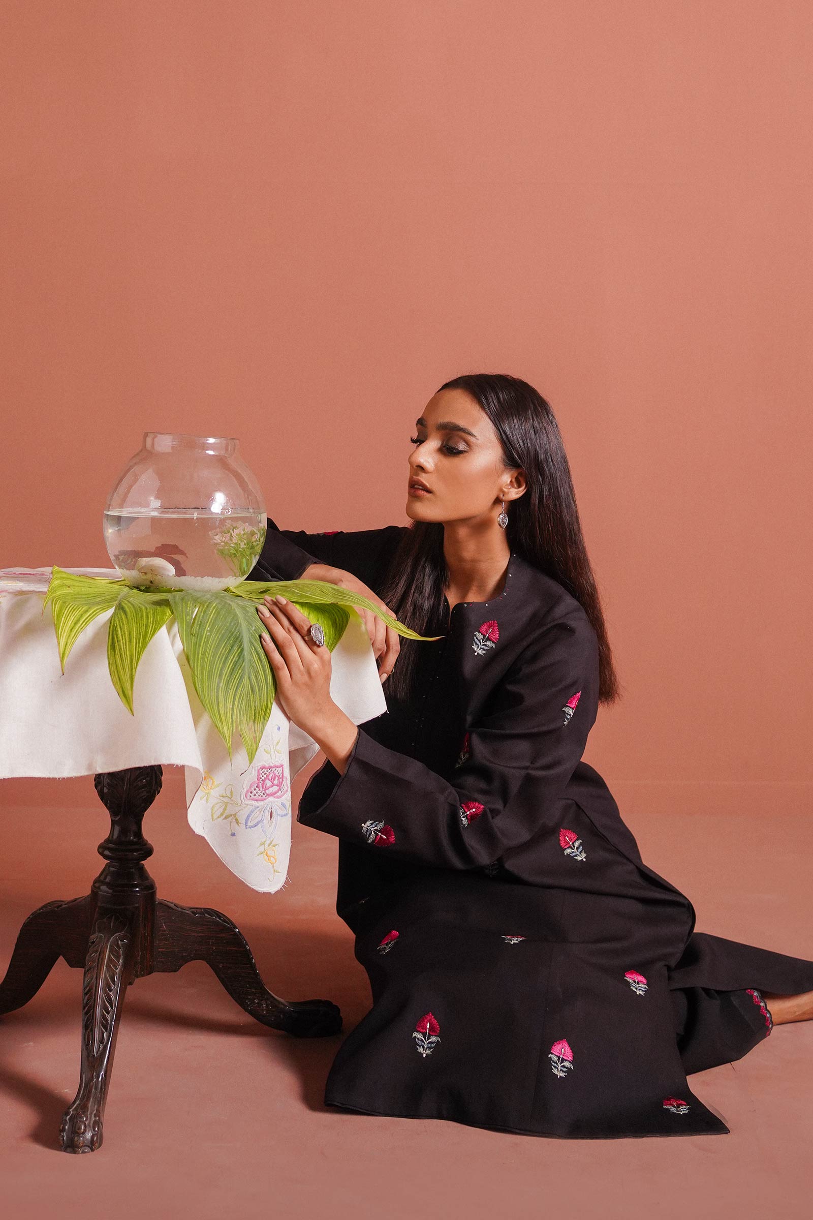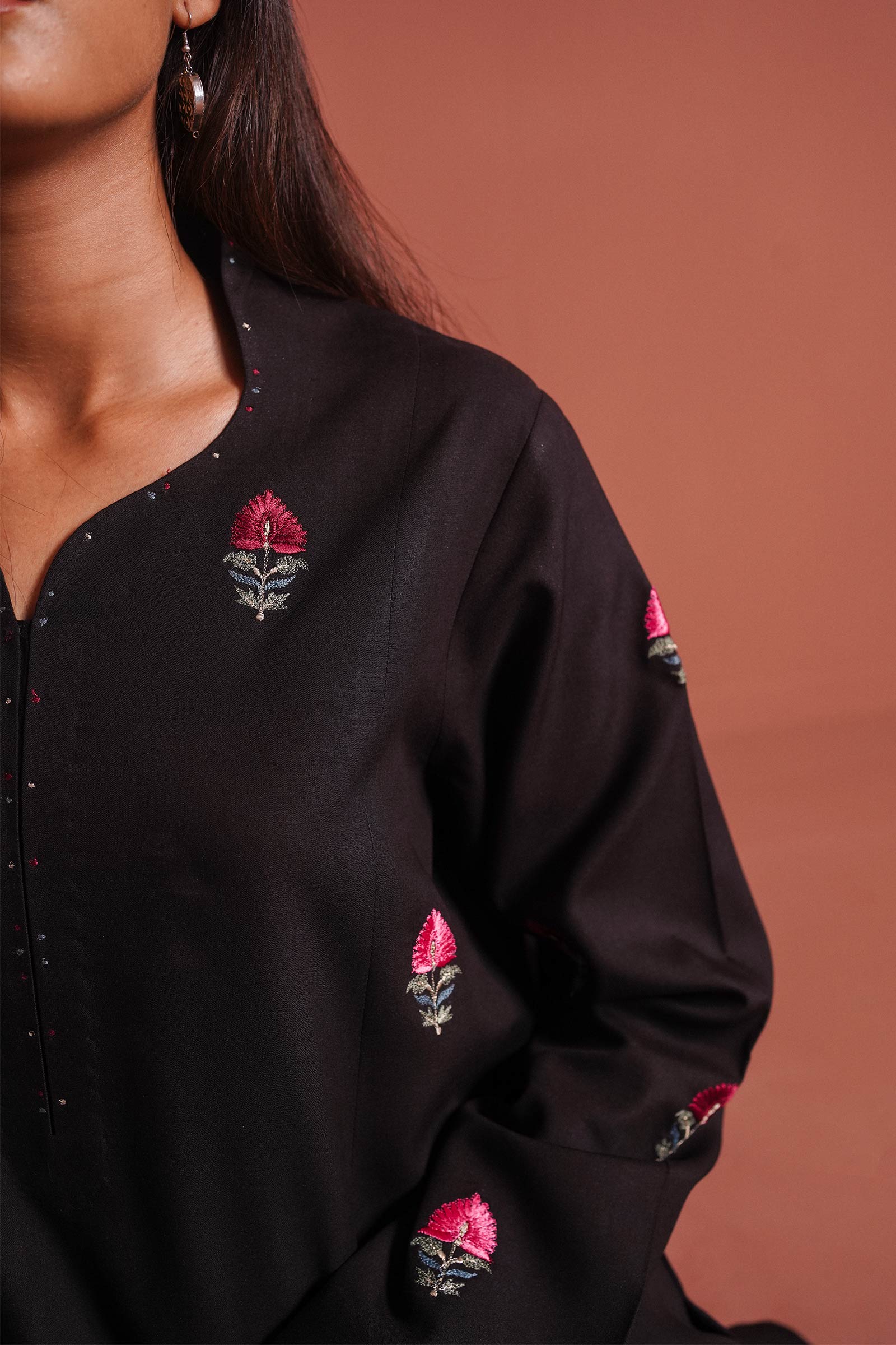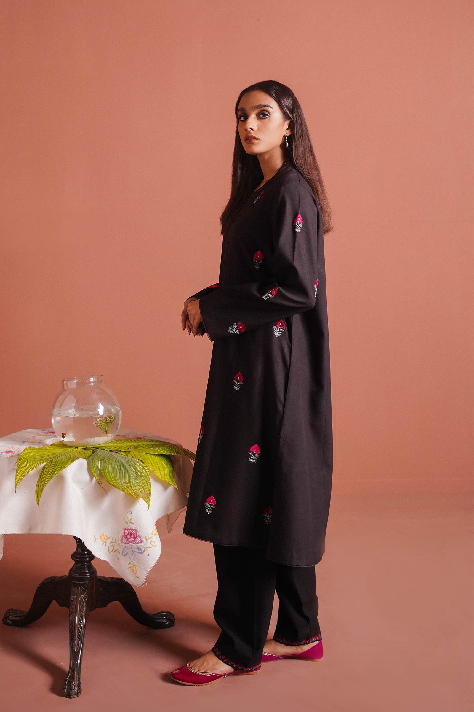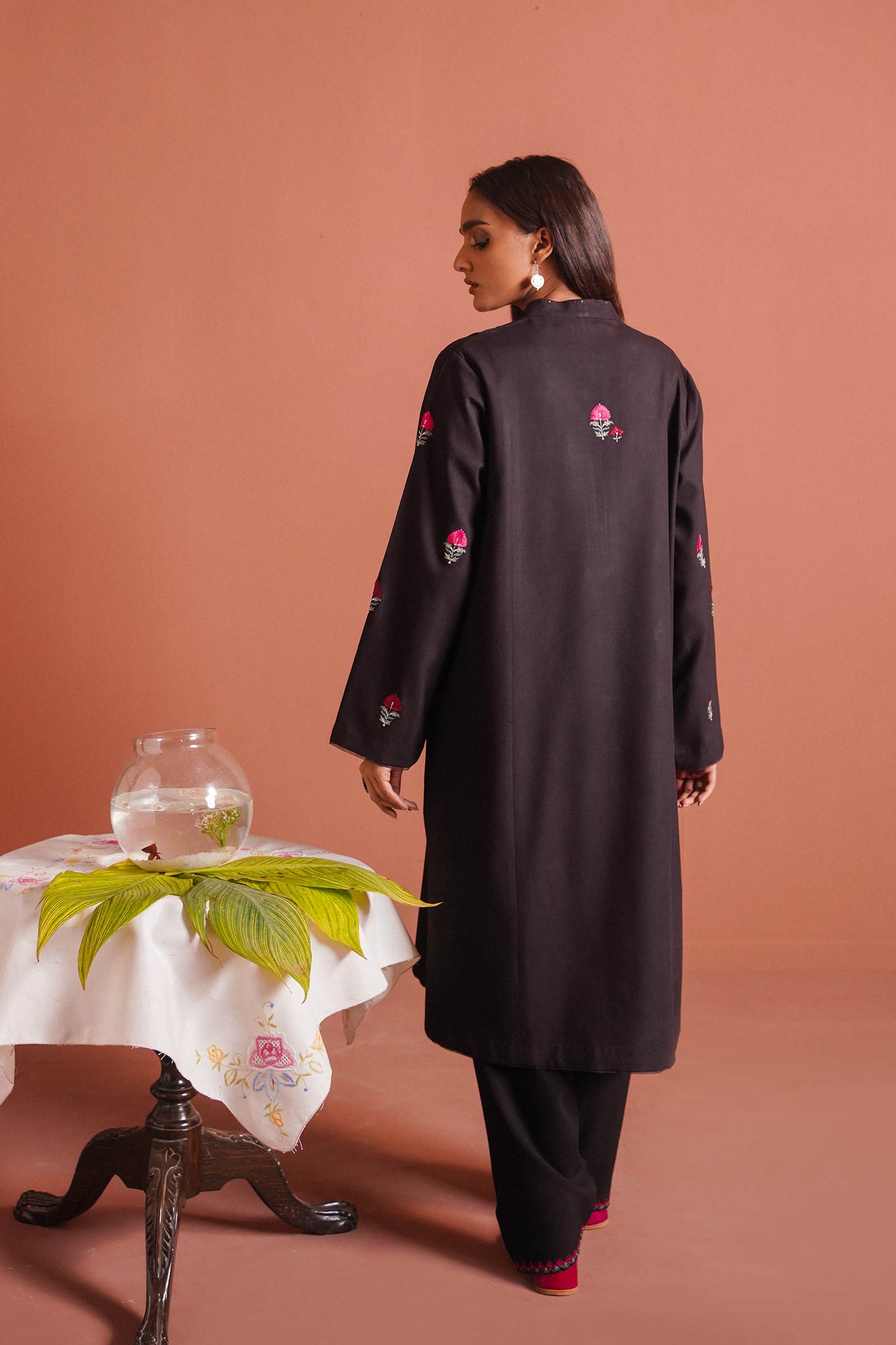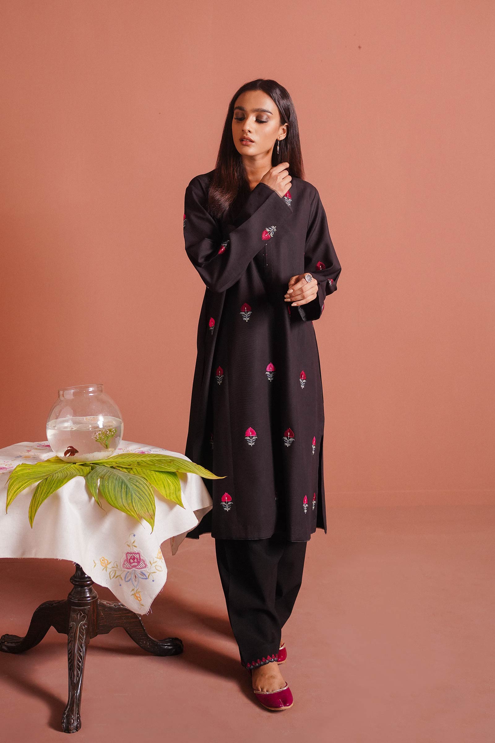 Black long flared kurta enhanced with a monotone motif spray all over and paired with a tapered shalwar.