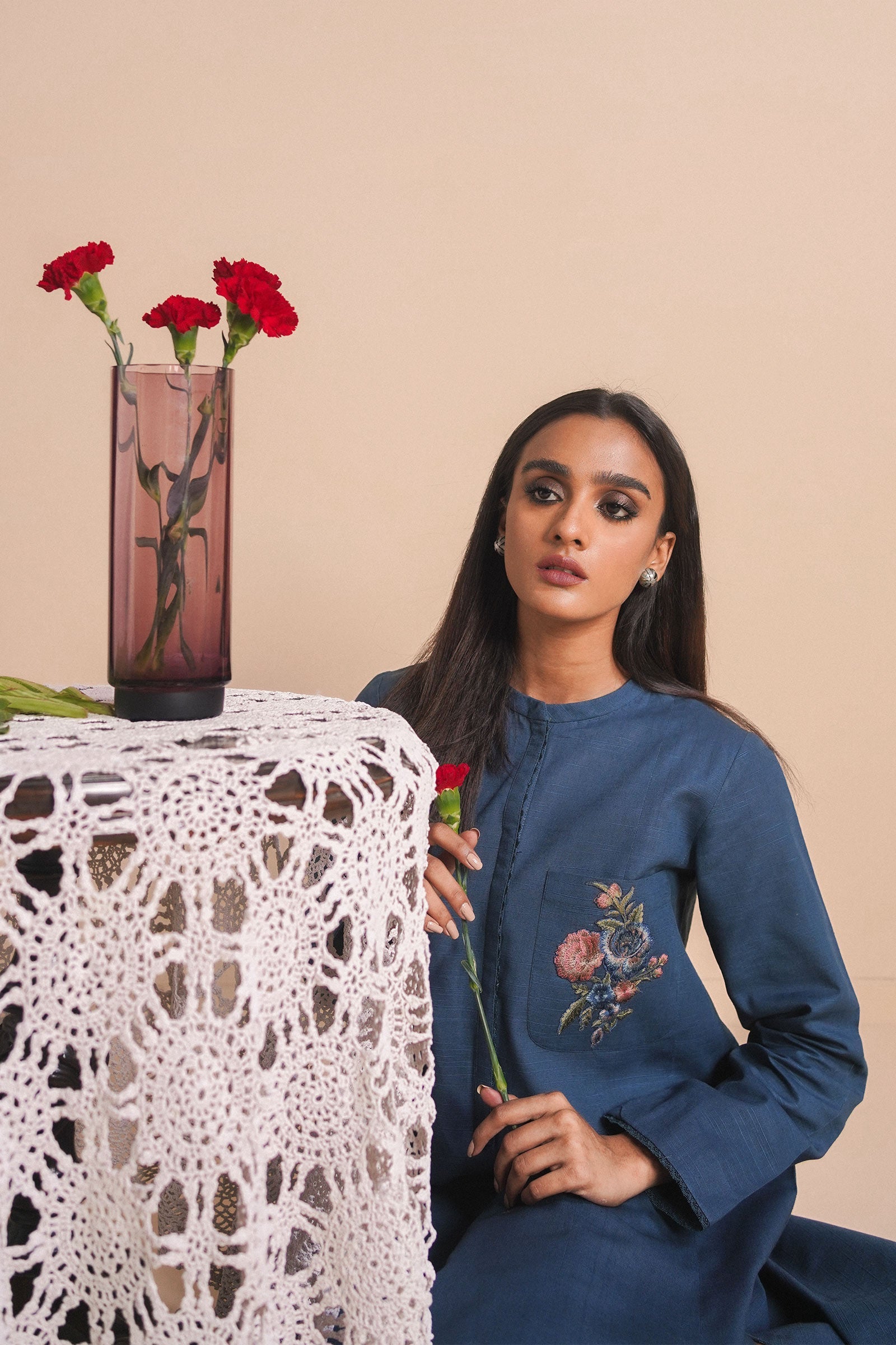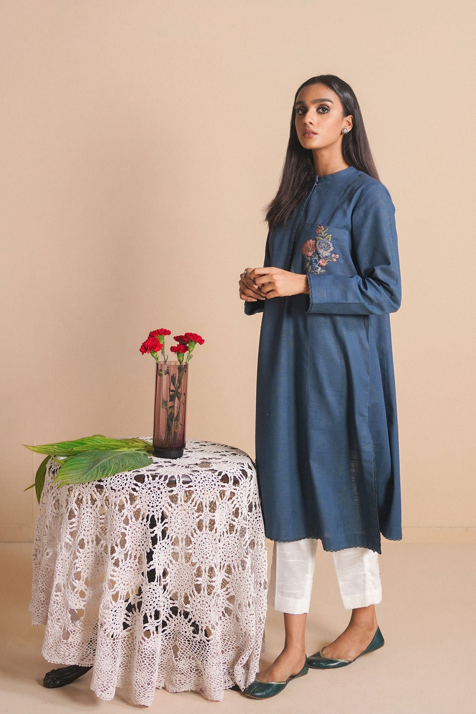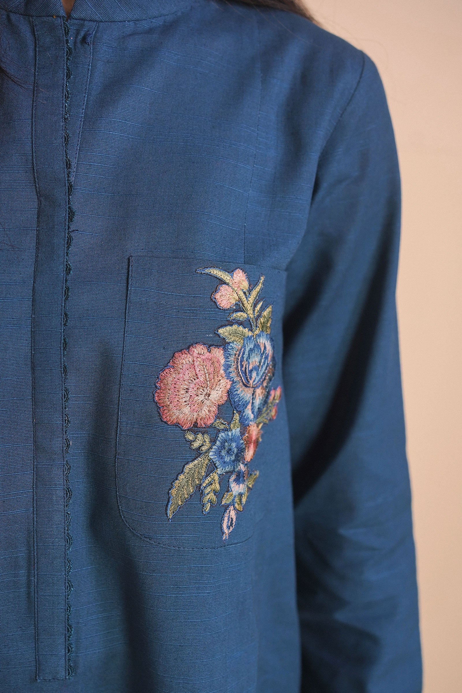 Prussian blue loose fit kurta enhanced with a floral embroidered pocket finished with intricate lace details.