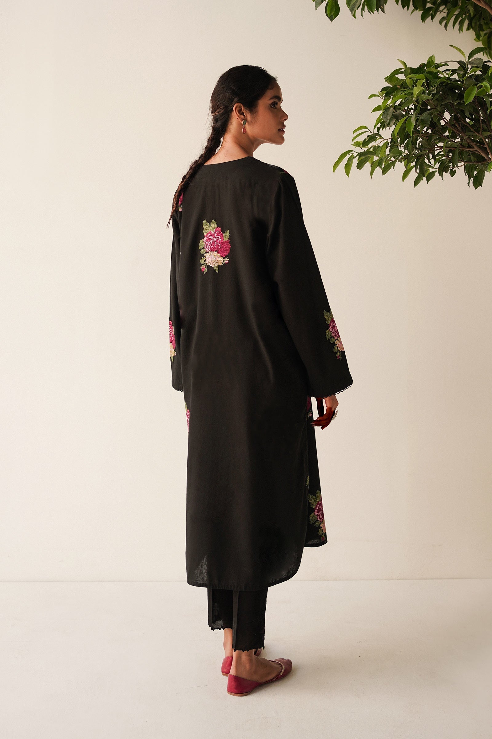 Straight-fit kurta in black, round hem detail with cross-stitch embroidery all over