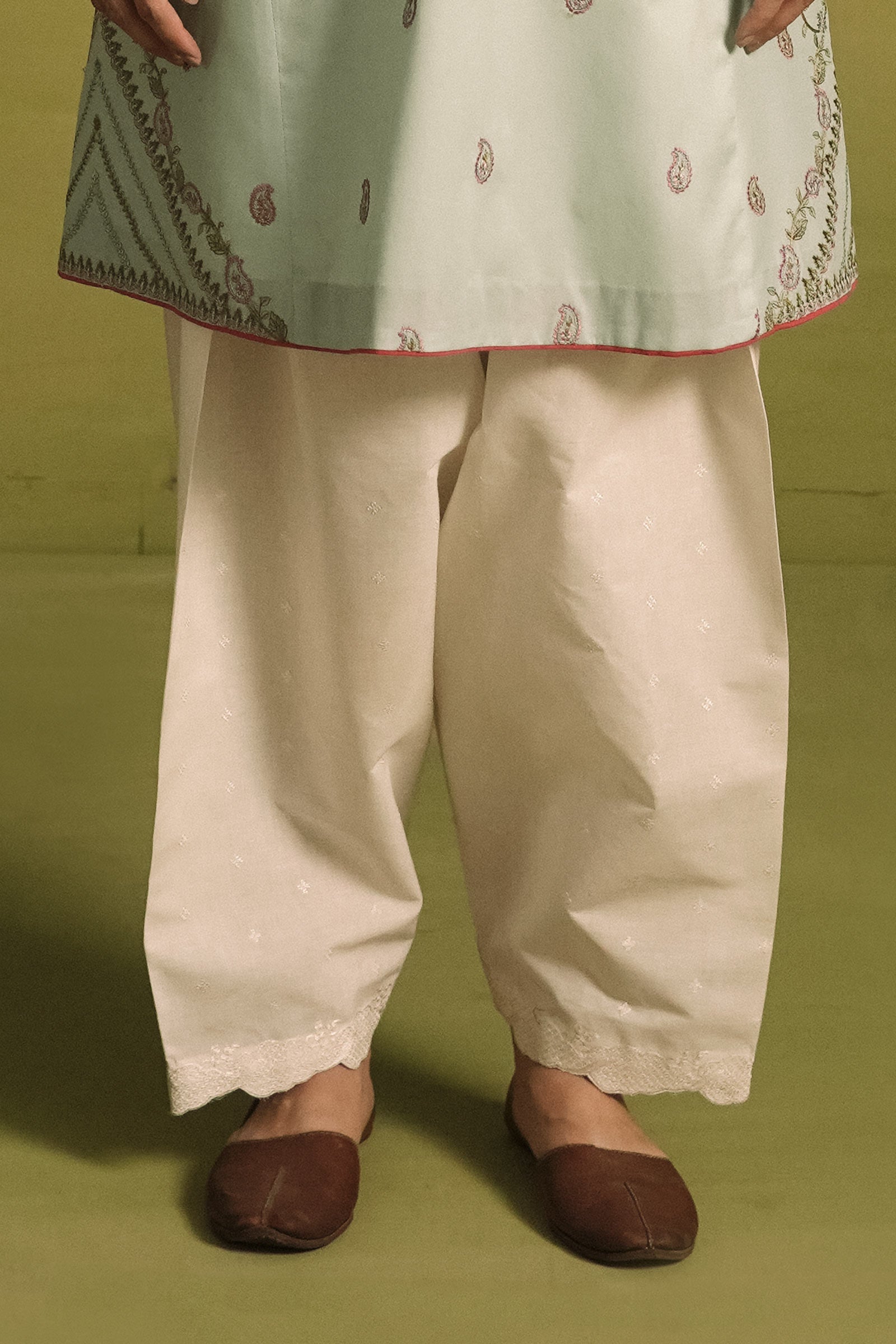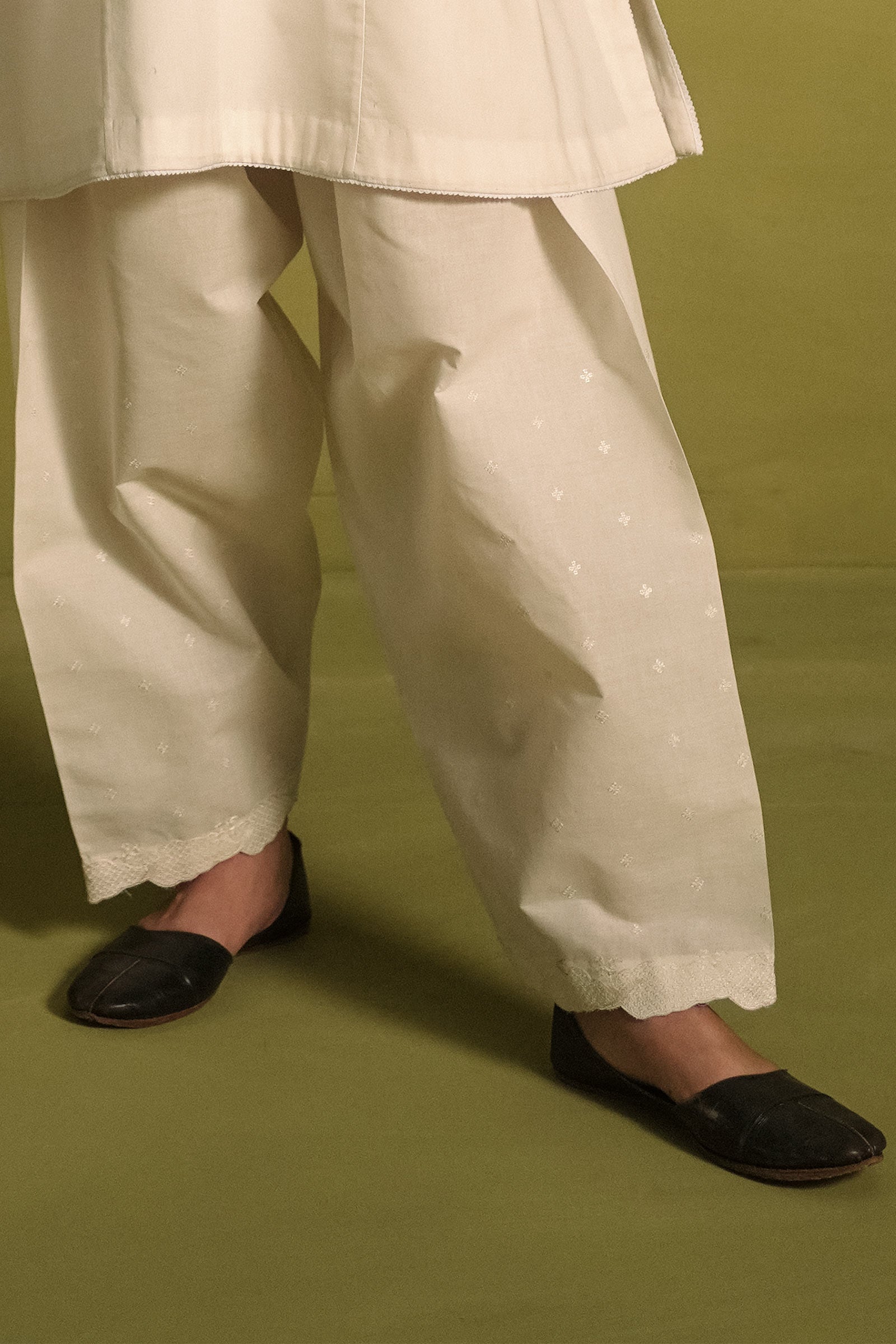 Tapered shalwar with cross-stitch embroidery on the hem.